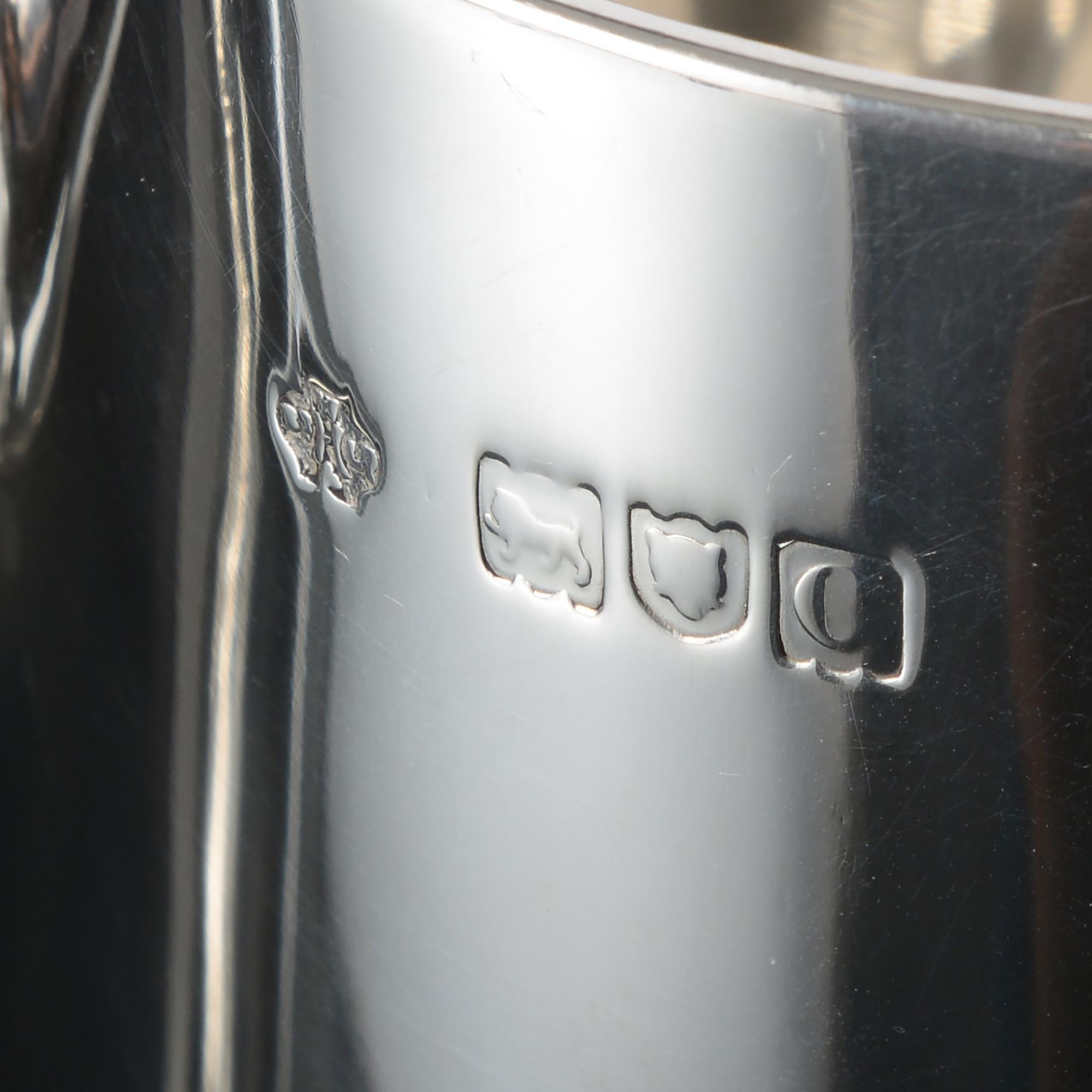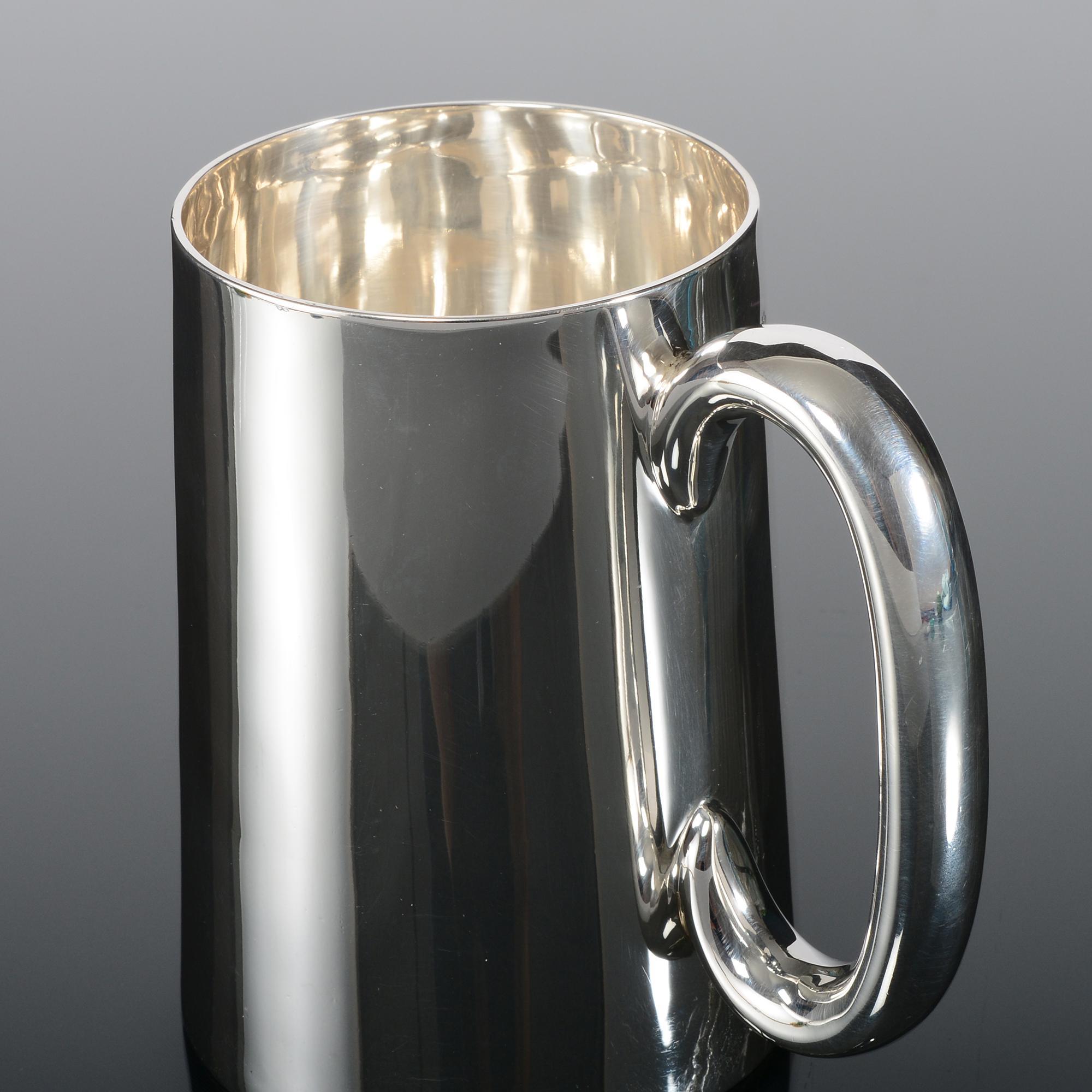 A silver mug is a lidless drinking vessel with a handle and English silver mugs were made in graduated sizes; the most common being the quart, pint, half pint and gill. Gallon and half gallon mugs like this example appear from time to time. The first "pots" (aka mugs) appeared in English taverns around 1650 and these early examples were tall with heavy banding, but around 1690
