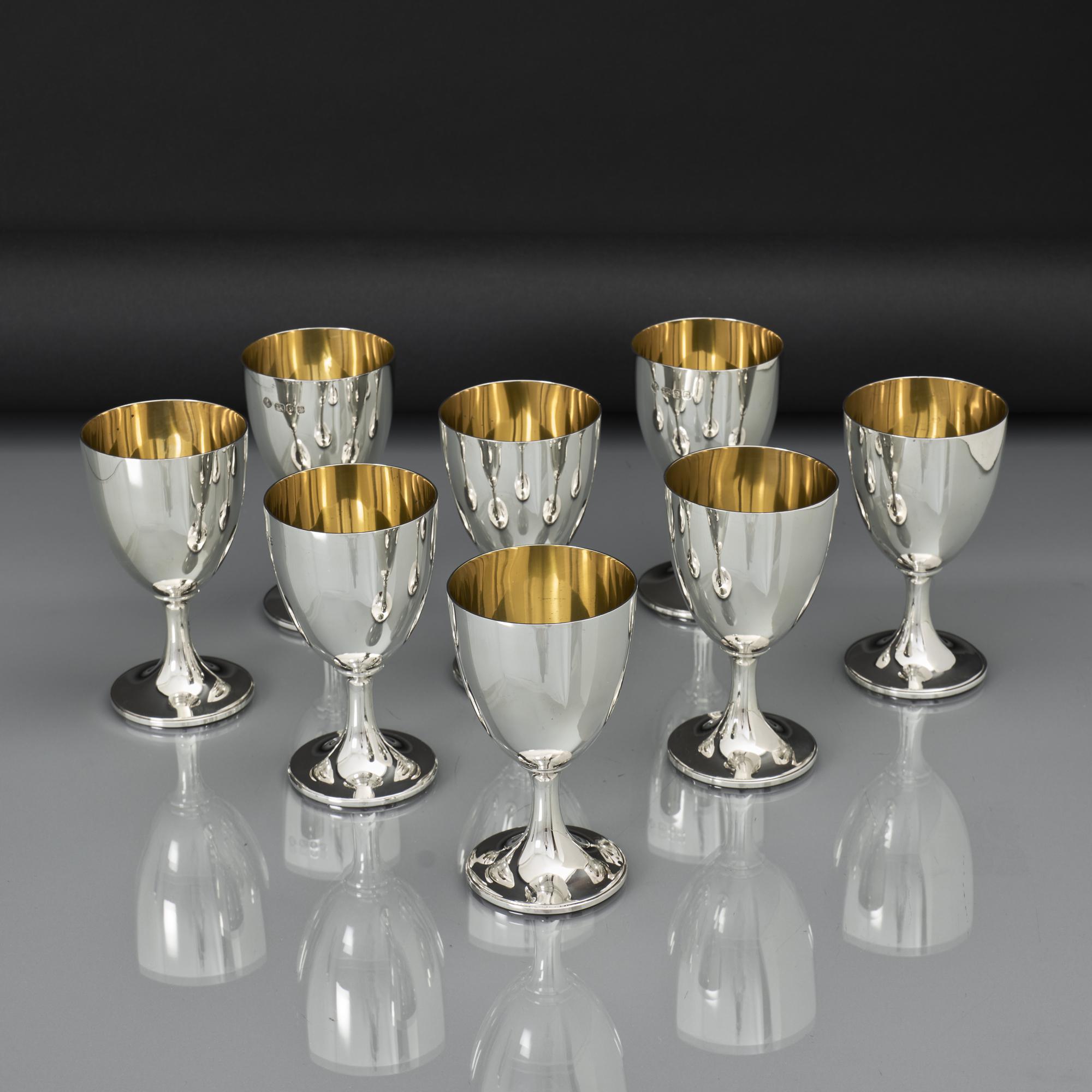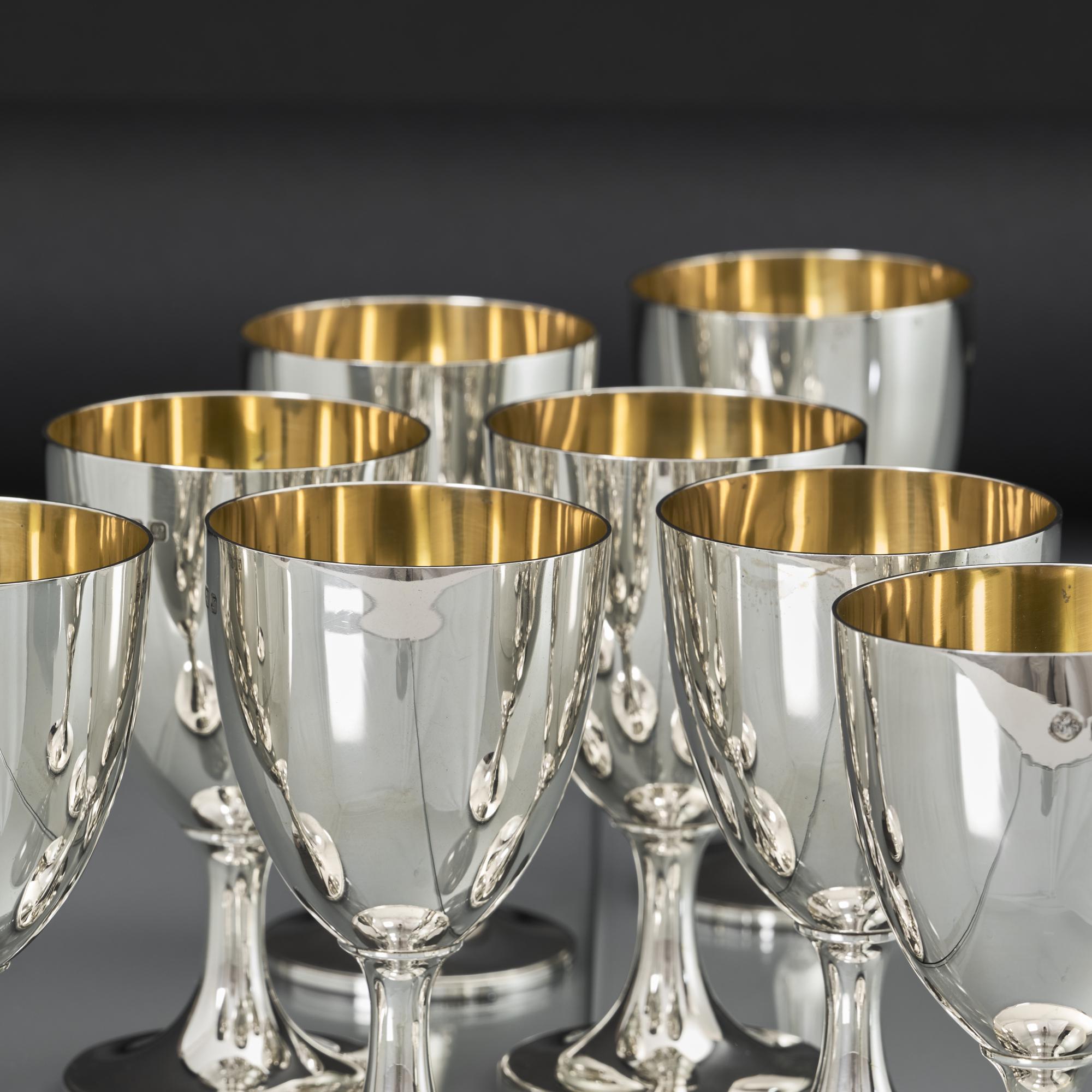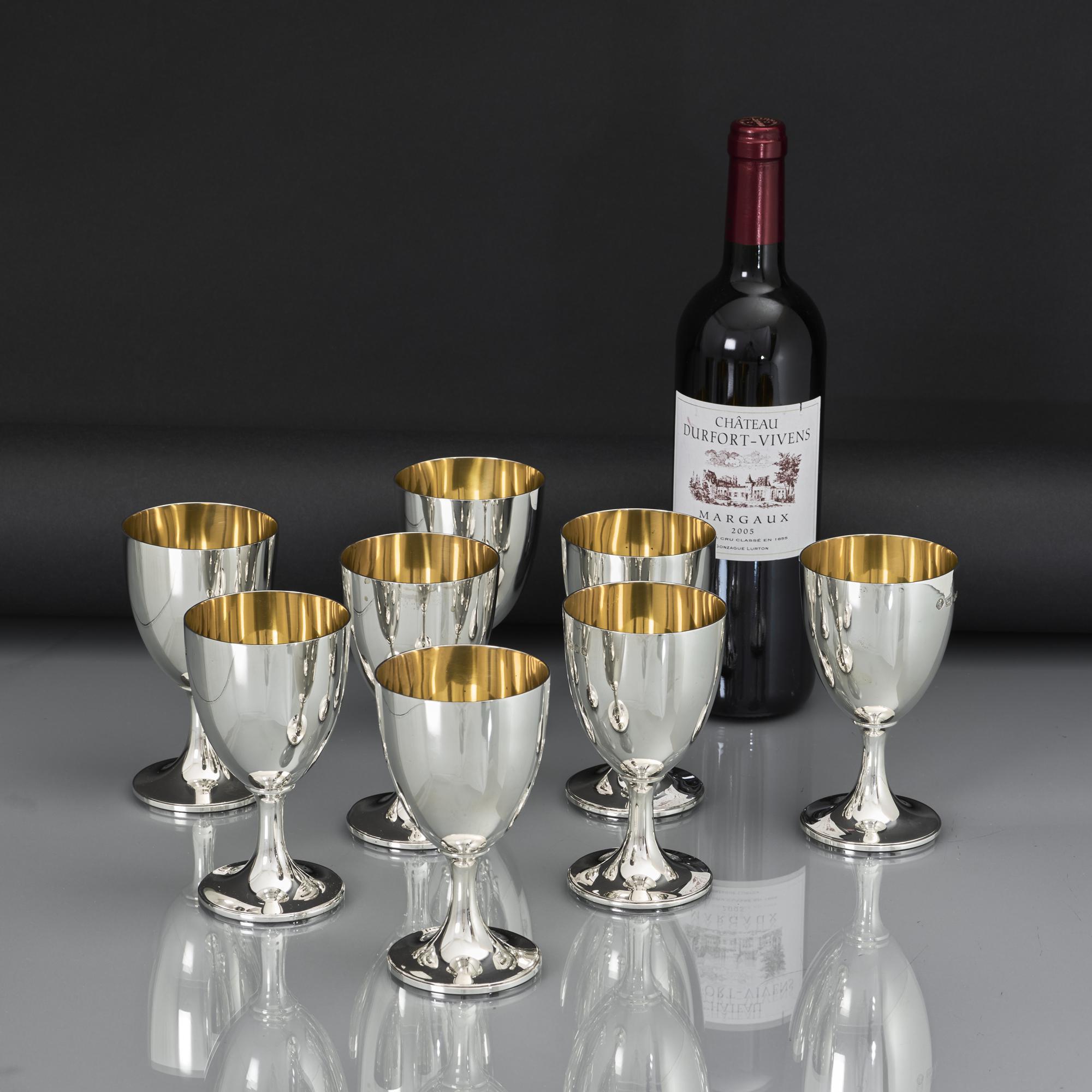 Set of eight 20th century silver wine or water goblets created in the George III style and featuring simple, plain round bodies on spreading circular bases. Each goblet's interior is nicely gilded, and the simplicity of these silver goblets lends them to being personalised with engraving.