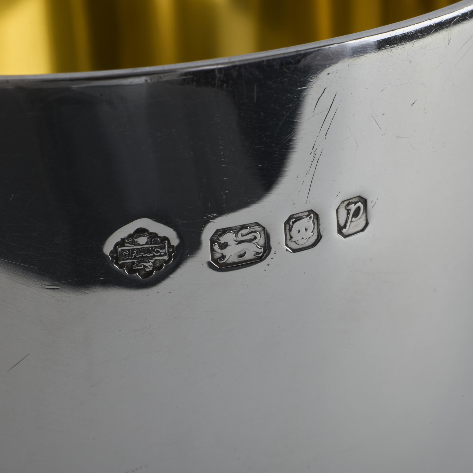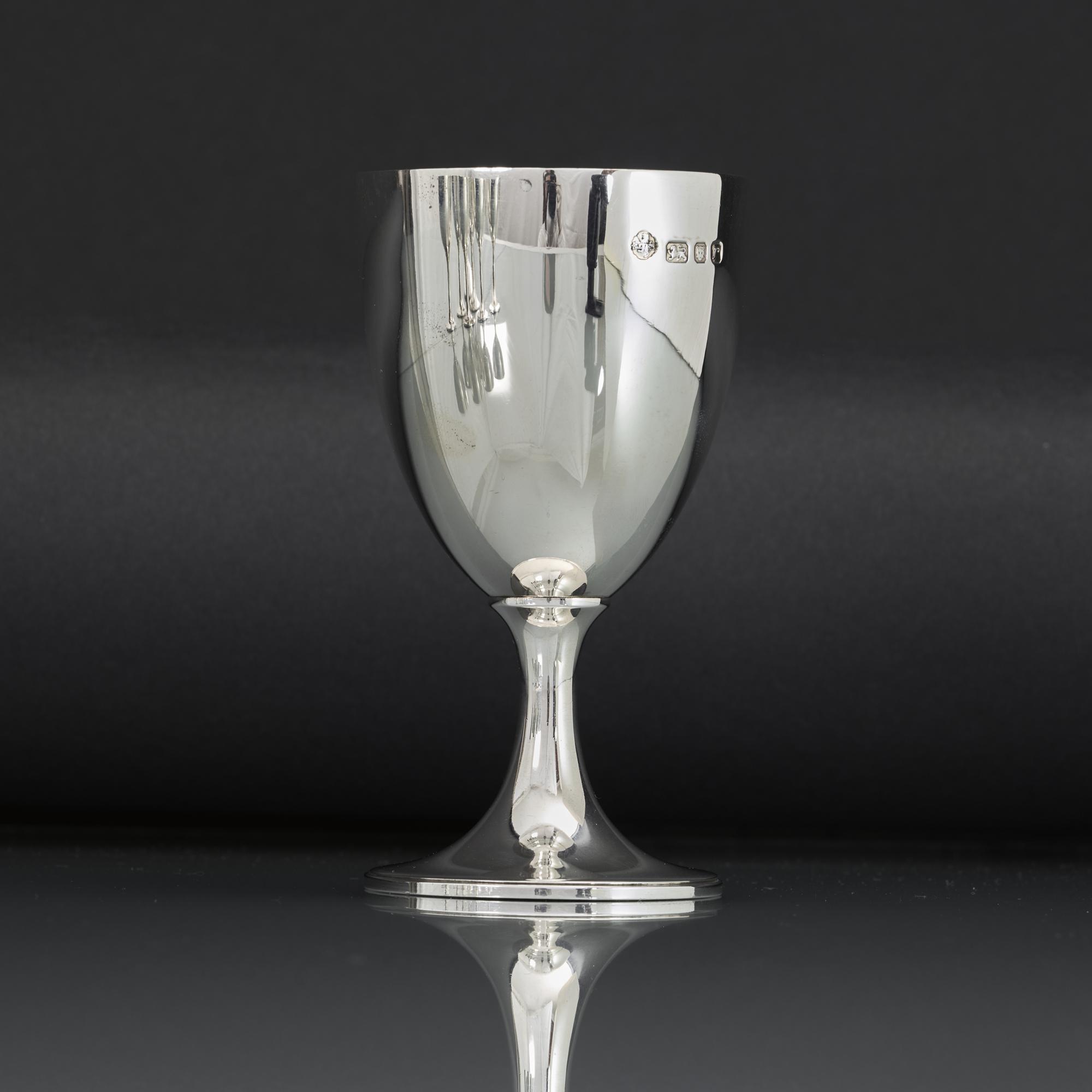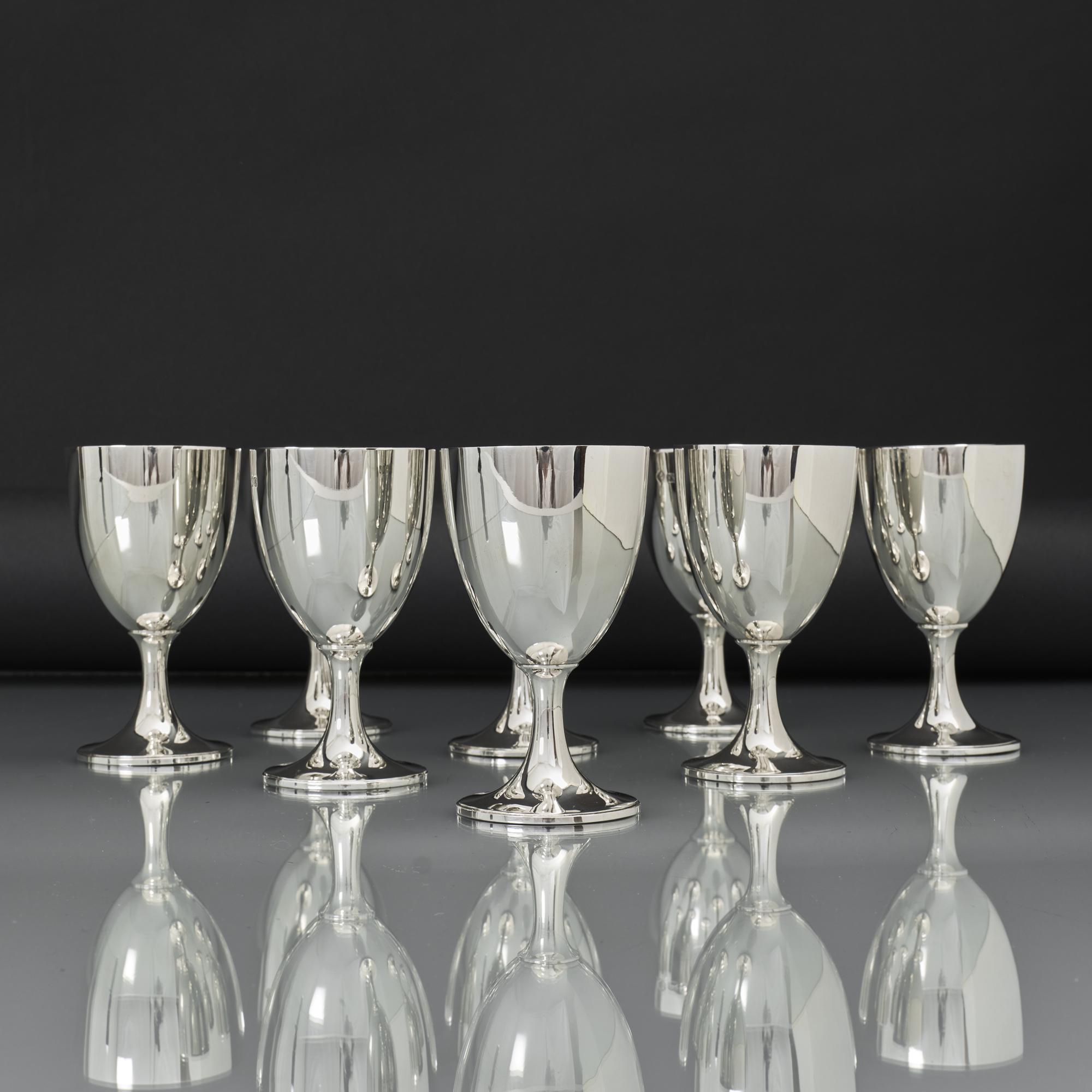 Set of eight 20th century silver wine or water goblets created in the George III style and featuring simple, plain round bodies on spreading circular bases. Each goblet's interior is nicely gilded, and the simplicity of these silver goblets lends them to being personalised with engraving.