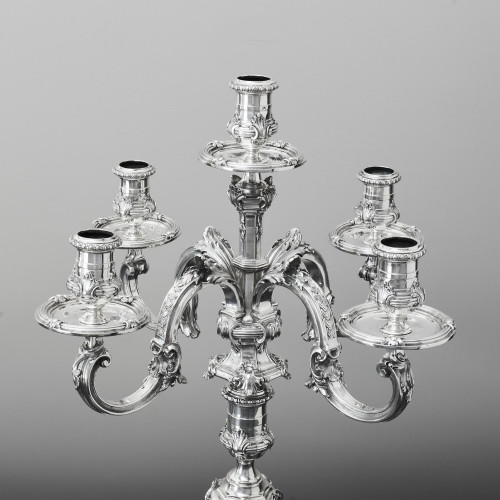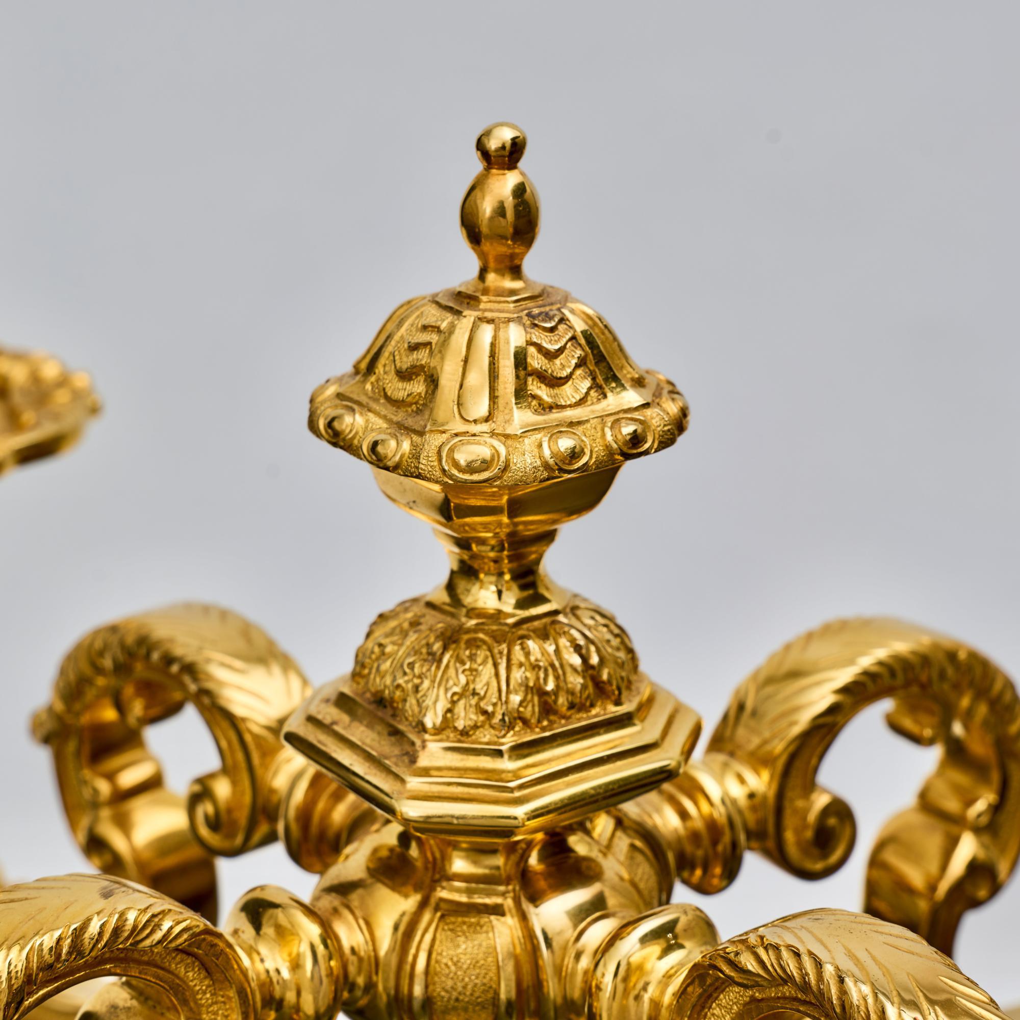 - Pair of 4-branch 4-light cast silver-gilt candelabra in 18th century Paul de Lamerie style