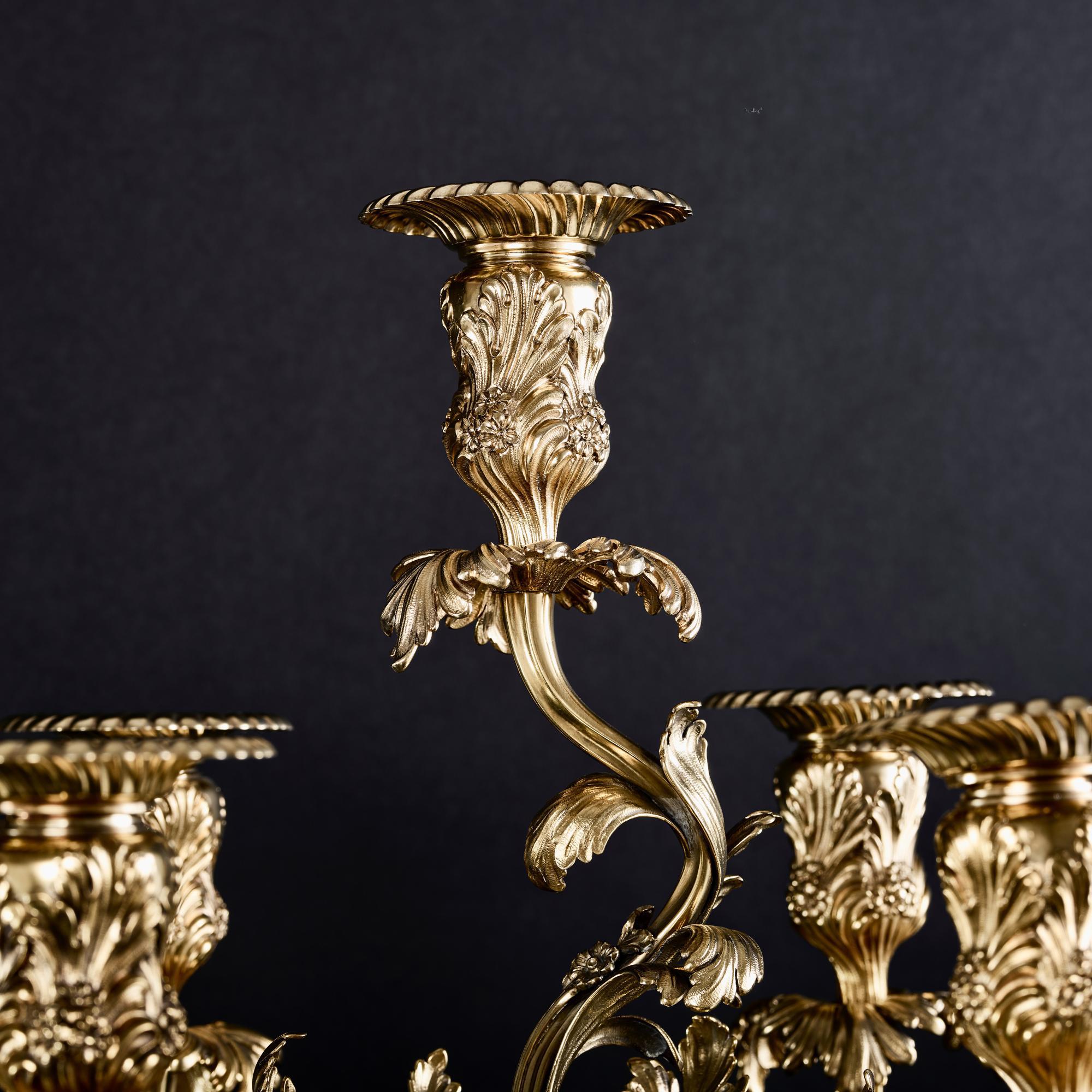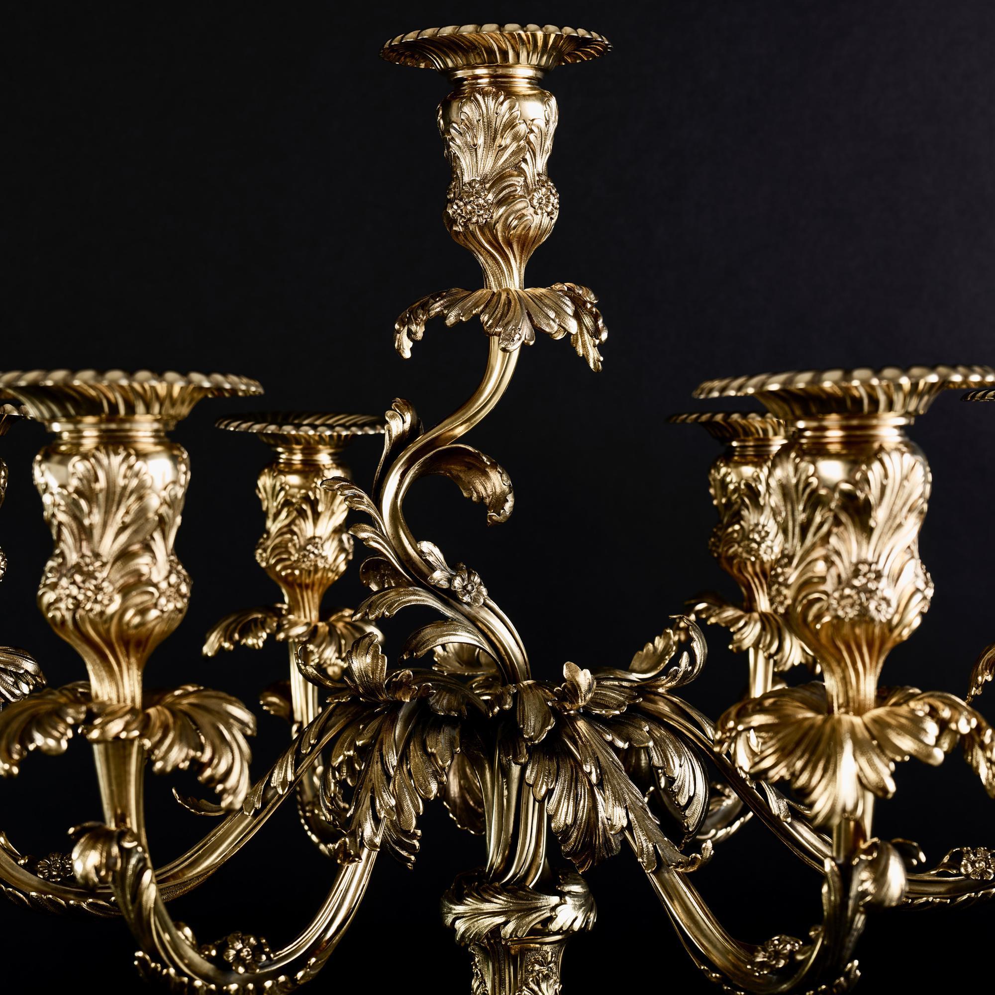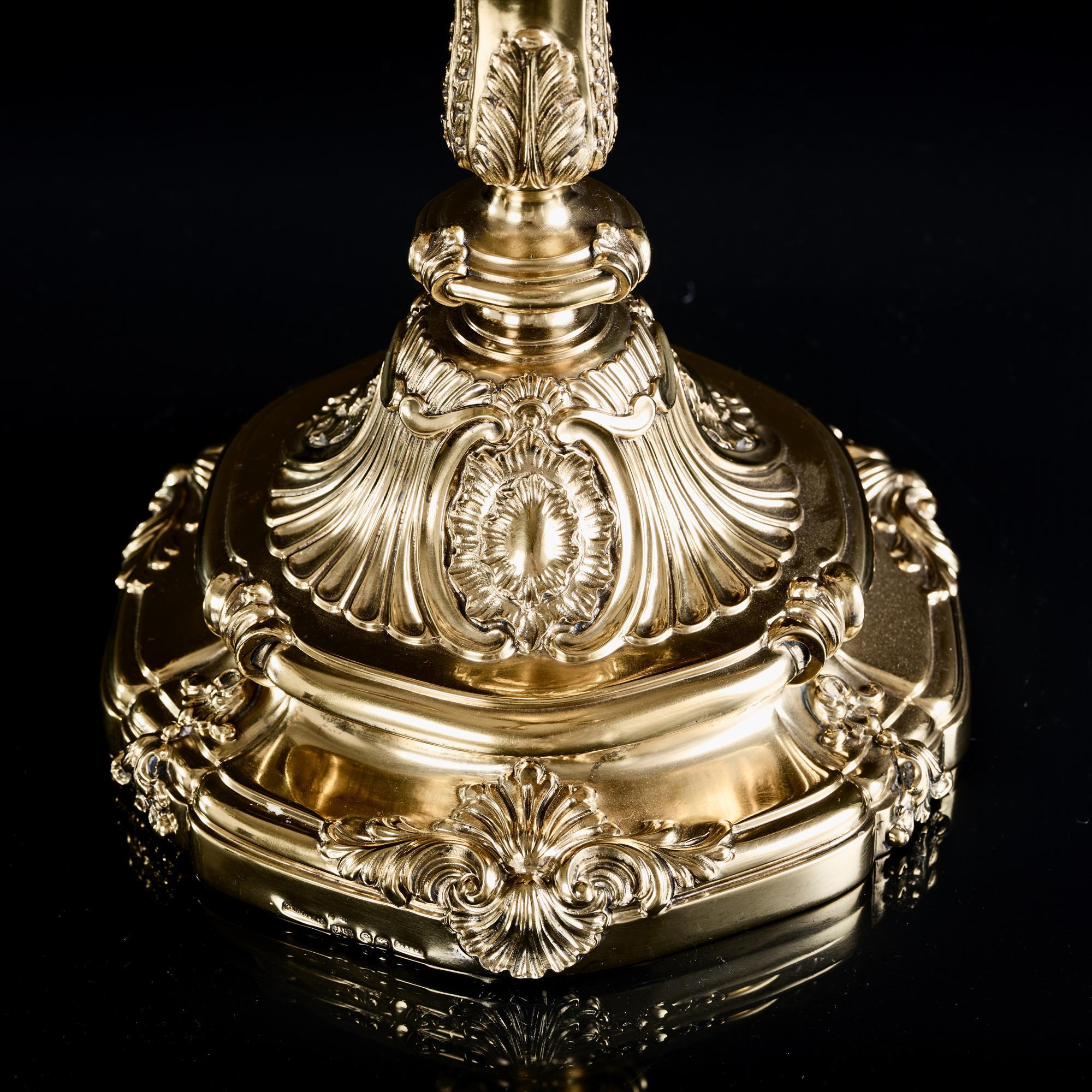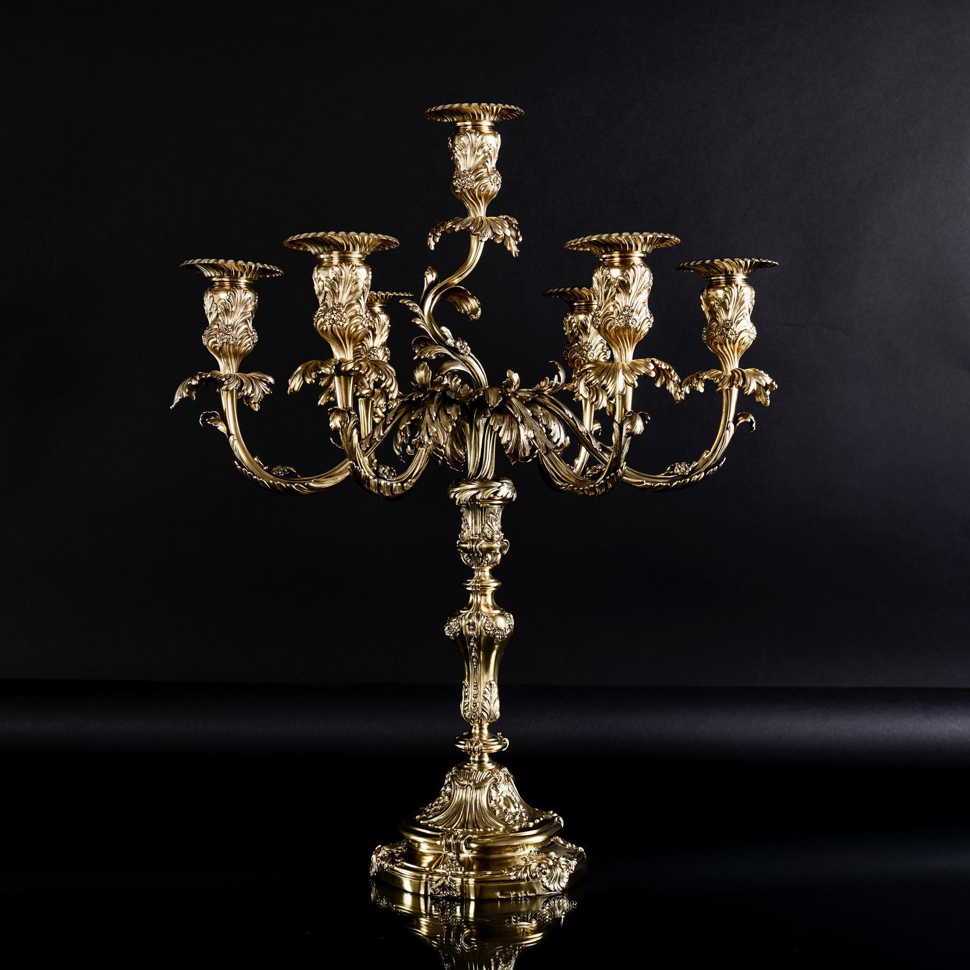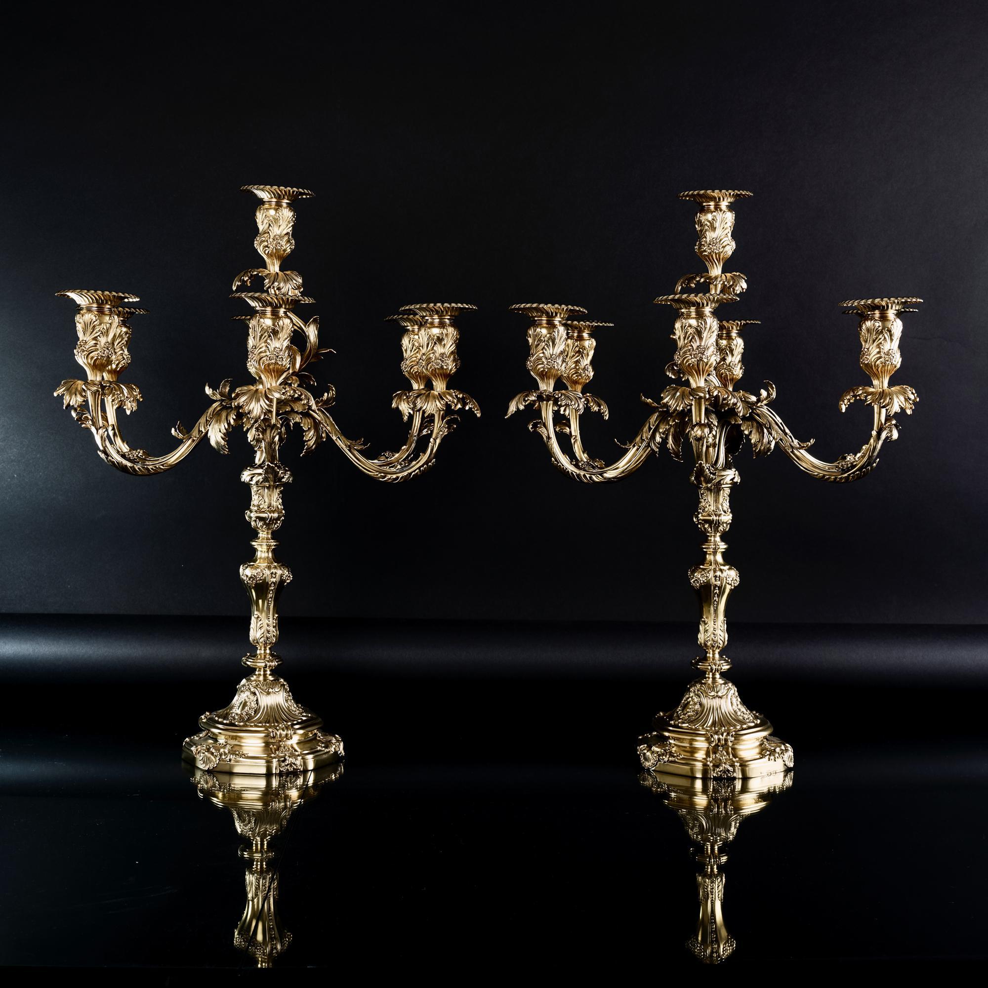 This is a magnificent pair of 7-light, silver-gilt candelabra sitting on shaped circular cast bases decorated with foliage, shells and rocaille. The cast baluster stems feature foliage and flowers and further leaf swags.