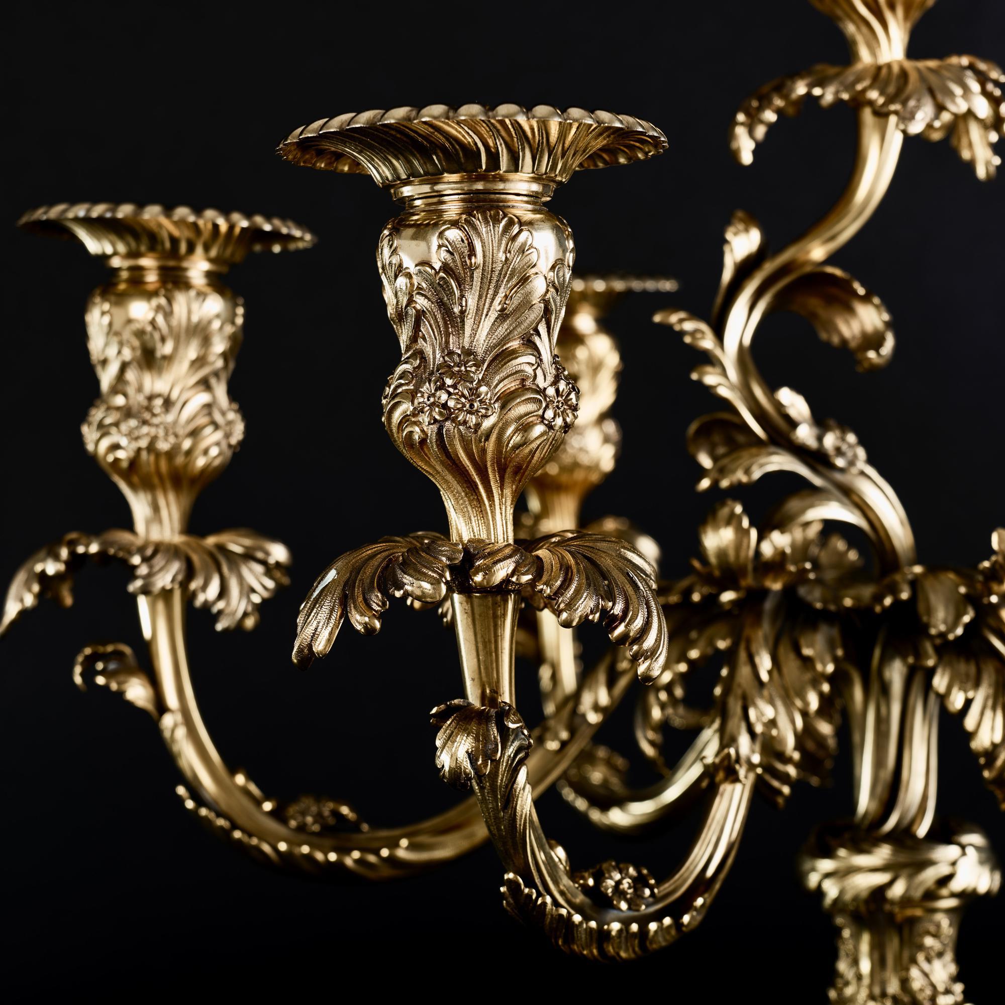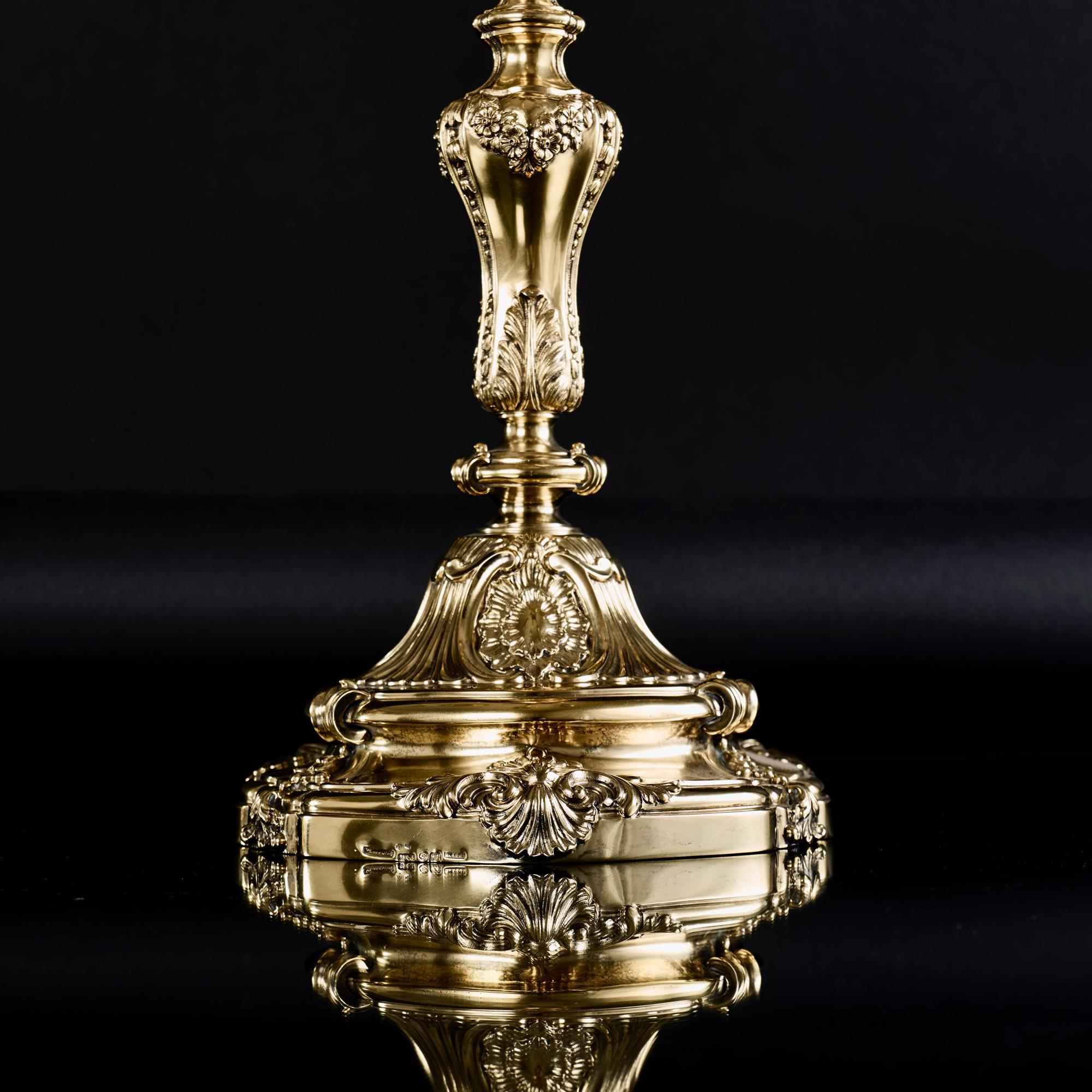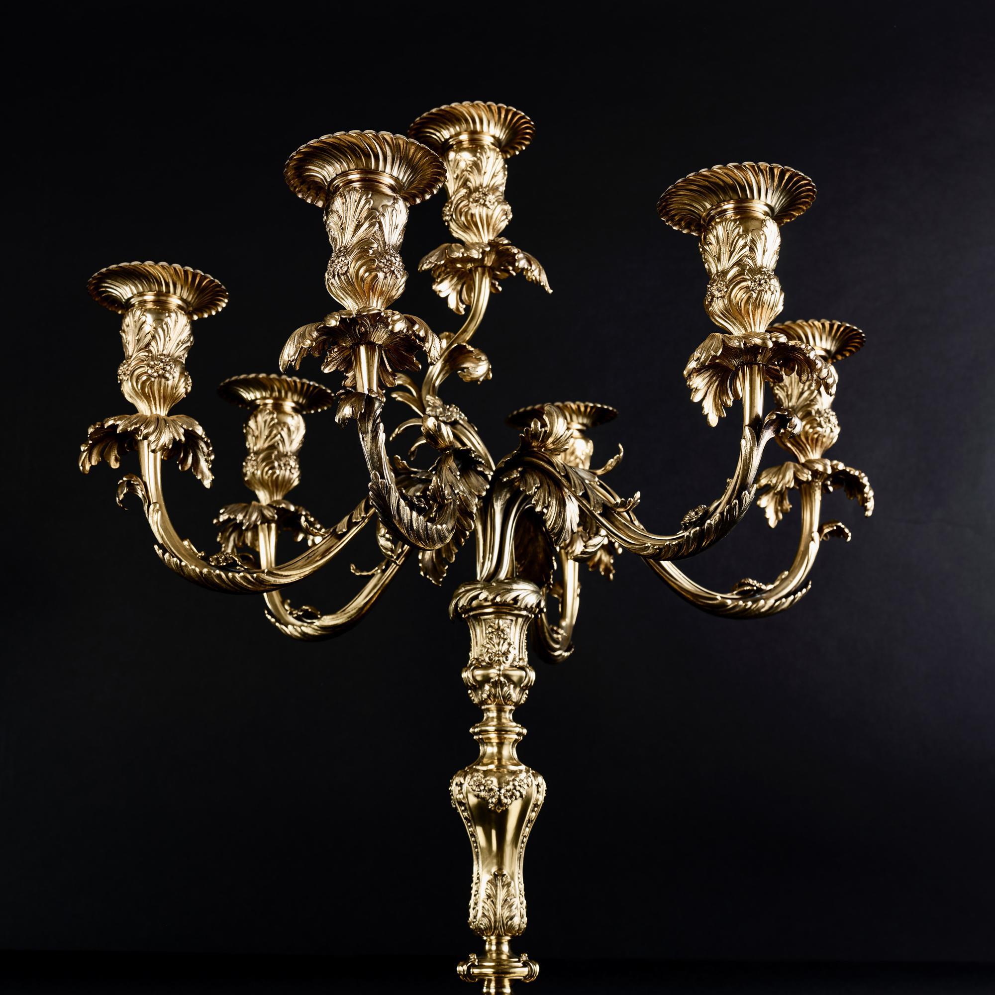 Considered one of the most beautiful 18th century French candlestick patterns, this pair of silver-gilt candelabra was made after a pair supplied by François-Thomas Germain in 1757-58 to King José I of Portugal.