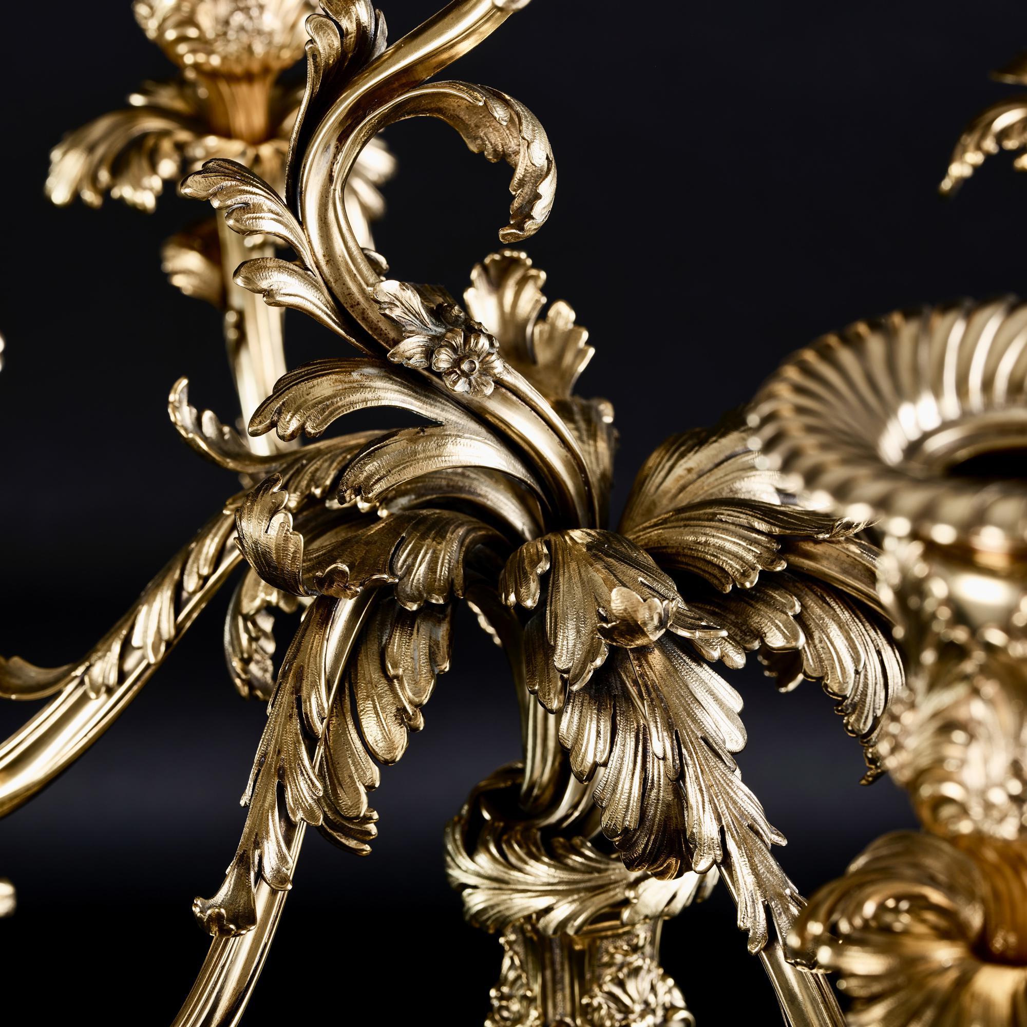The six branches are each lavishly cast with foliage and applied with flowers, terminating in foliage and flower-cast sockets, and with detachable fluted wax-pans, with similar central branches.
