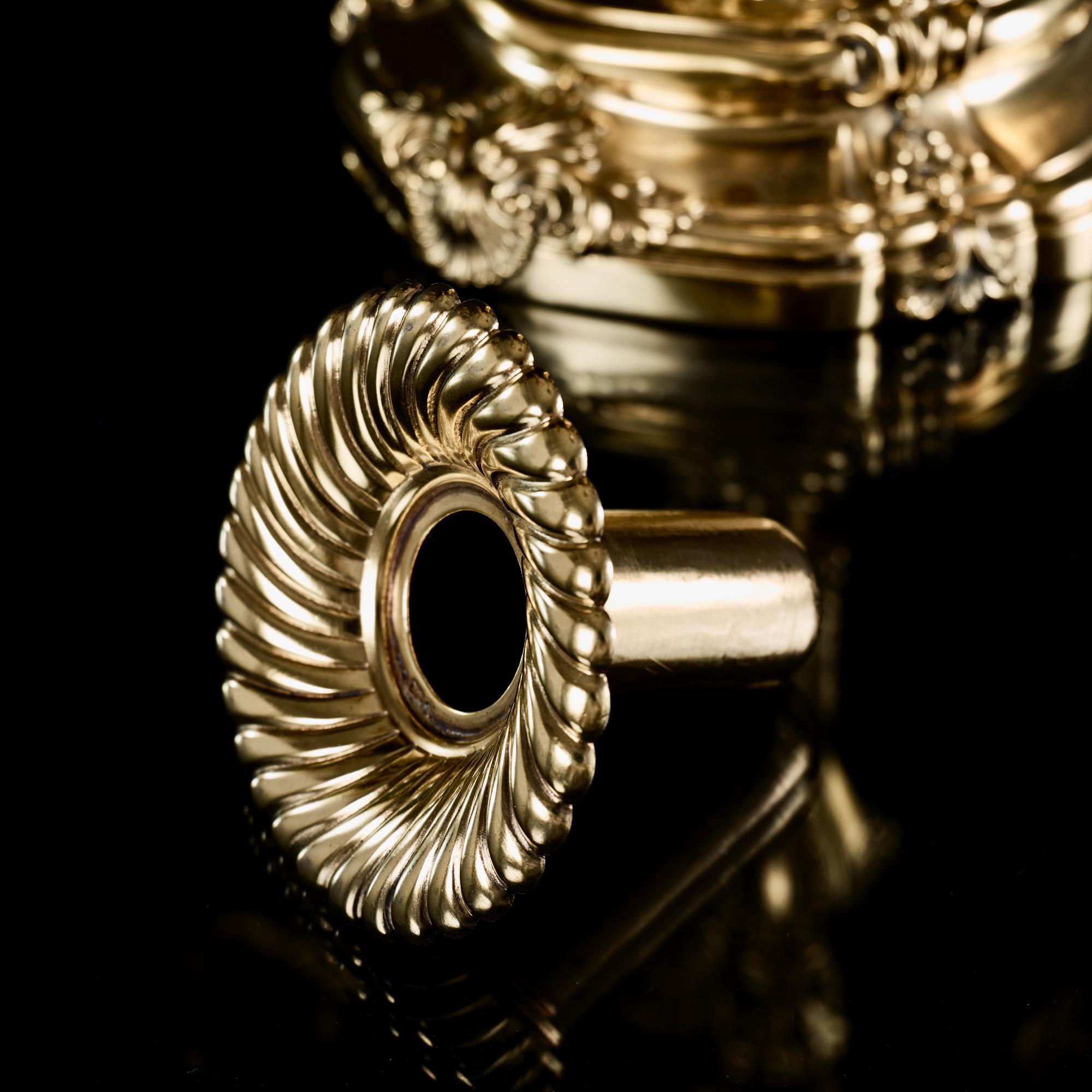 This pair of large 7-light silver-gilt candelabra is not available to purchase online. Please contact us if you would like more information or are interested to buy them.