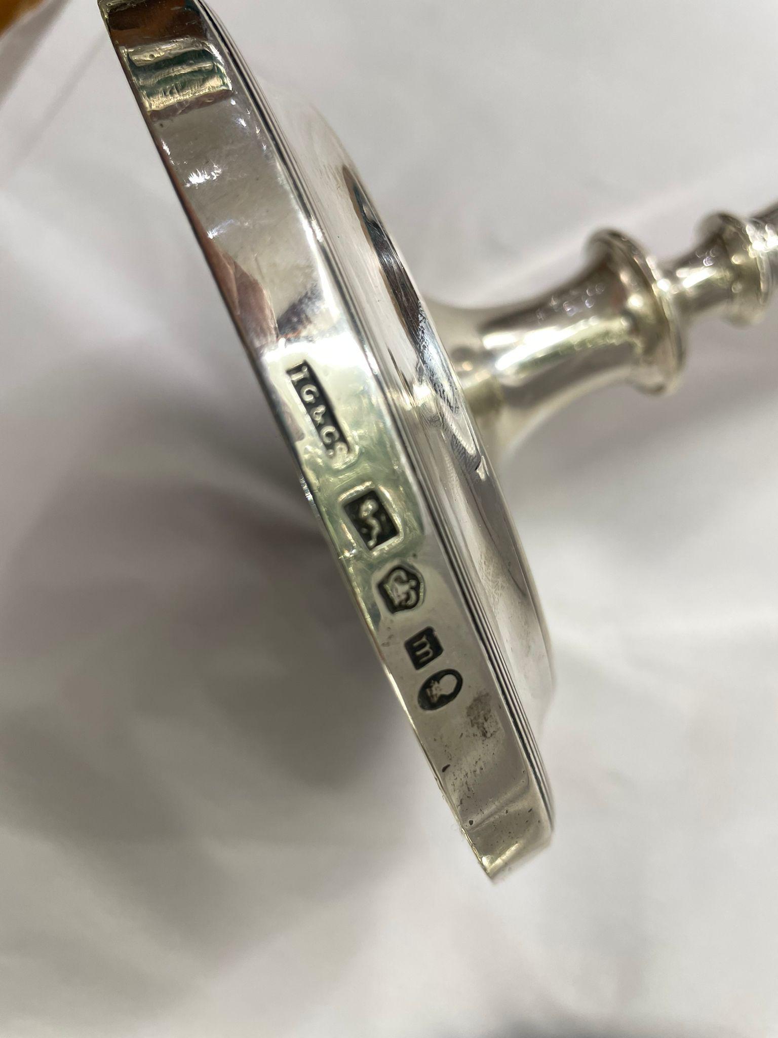Pair of heavy-gauge antique sterling silver candlesticks made during the latter part of the 18th century. The elegant fluted and tapering stems and bases, as well as the removable nozzles, are decorated with thread pattern mounts. Each candlestick is engraved with the family coat of arms belonging to Thornton Roger Trevelyan, and engraved with the family motto "Tyme Tryeth Troth" which translates to "time is running out".