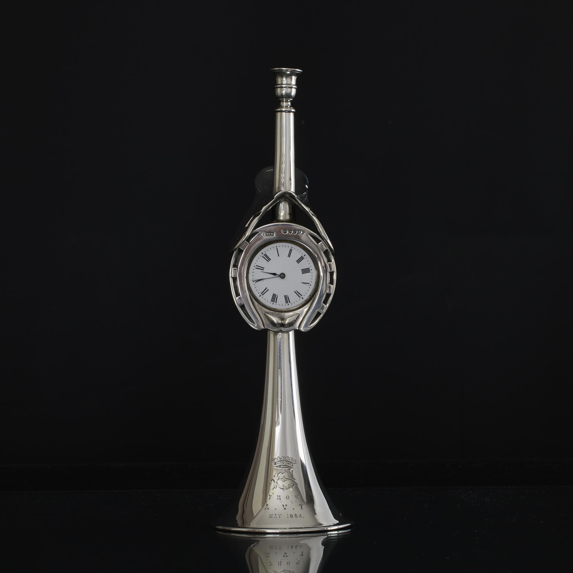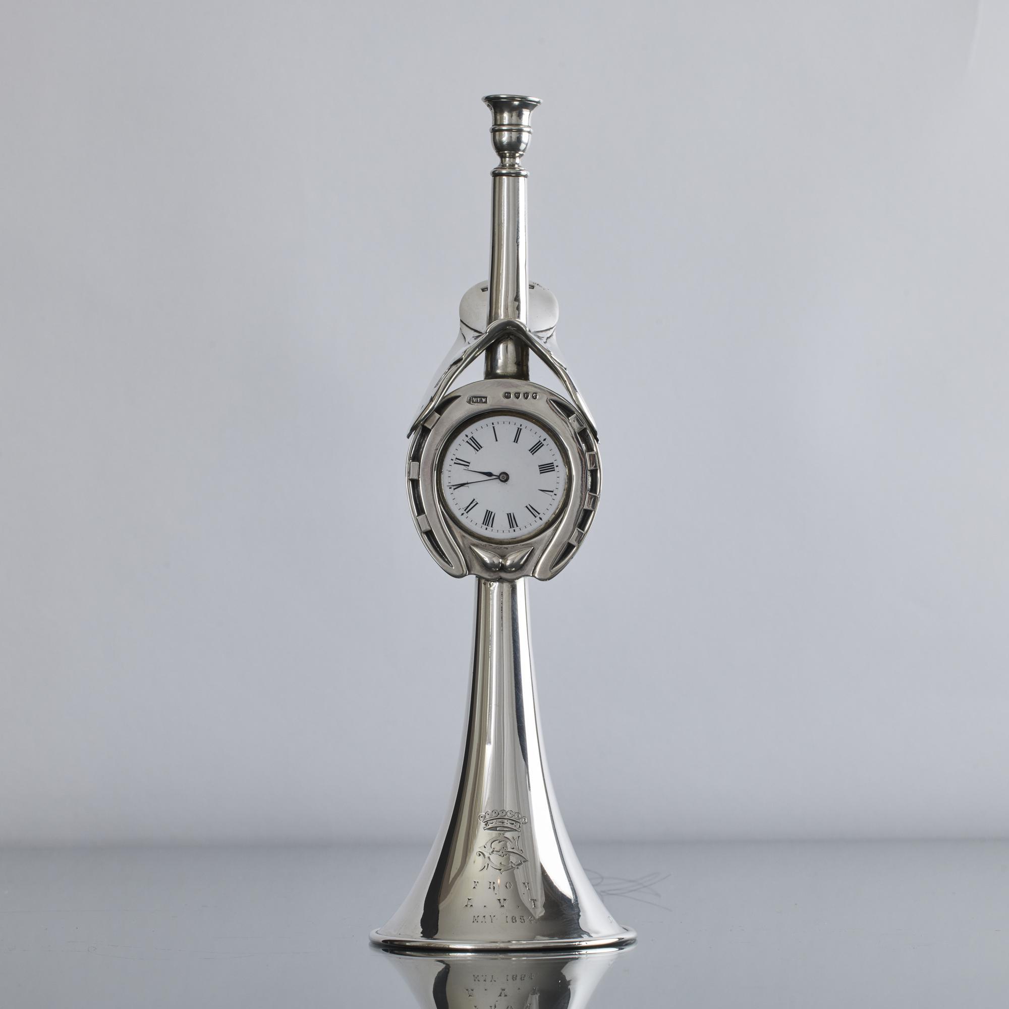 - Victorian silver hunting horn clock