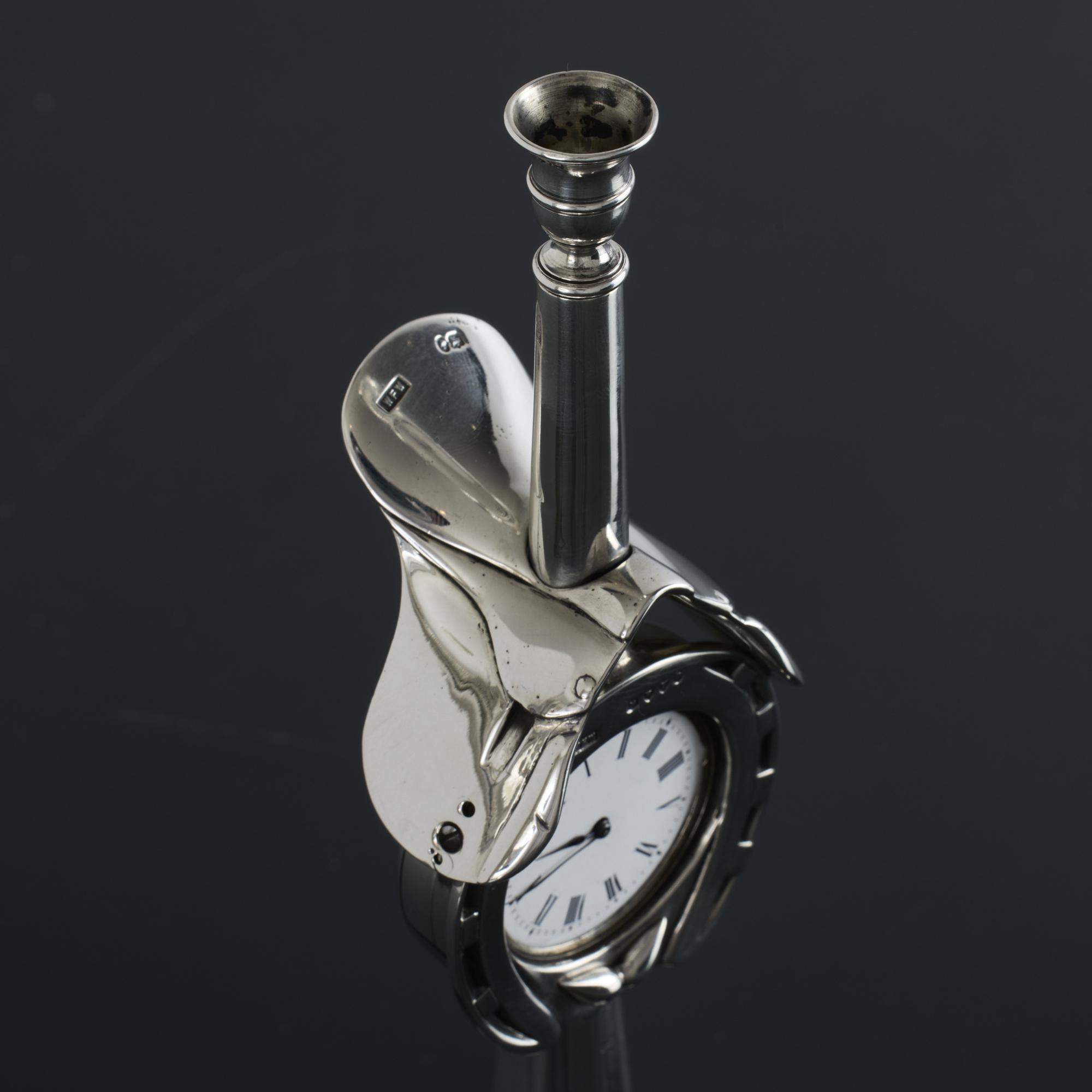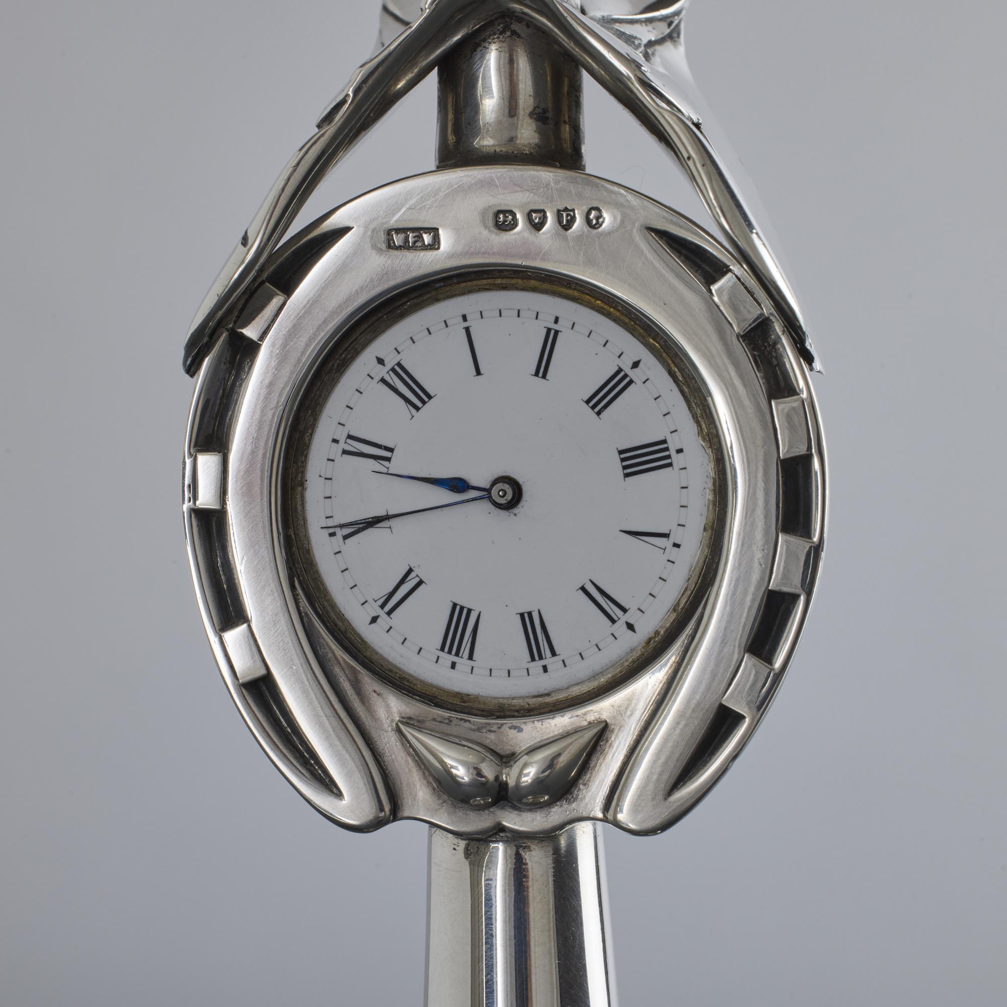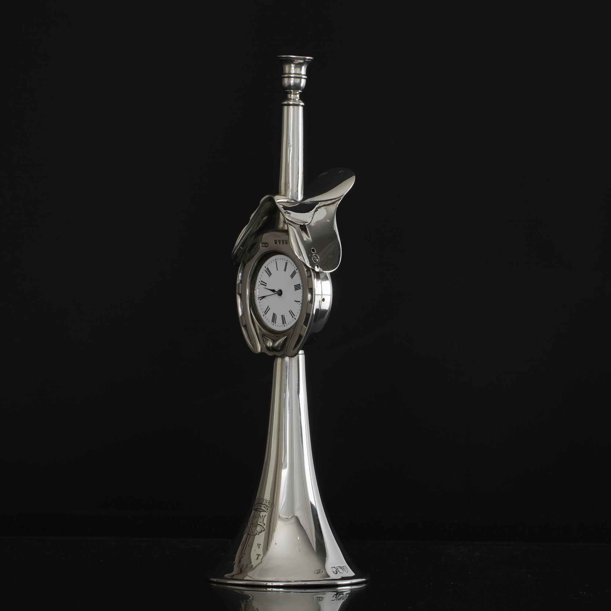 Of fox hunting or horse riding interest, this late-Victorian-era antique silver-cased clock has been created in the form of a hunting horn, featuring a horseshoe framing the clock face, and surmounted by a silver saddle.