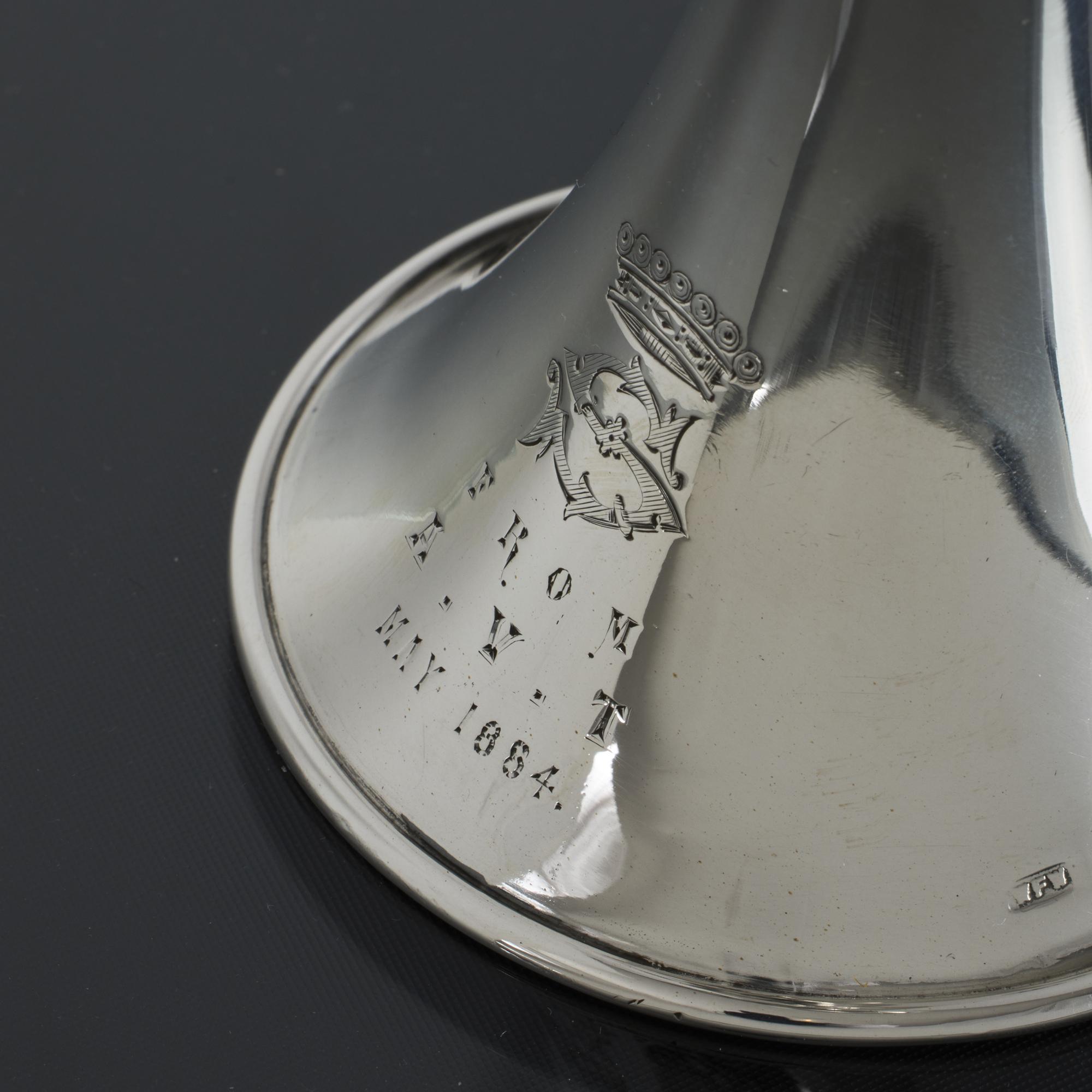 With the clock in full working order, the hunting horn surround is engraved with an unidentified ducal coronet and engraving featuring the initial S and From A.V.T. 1884.