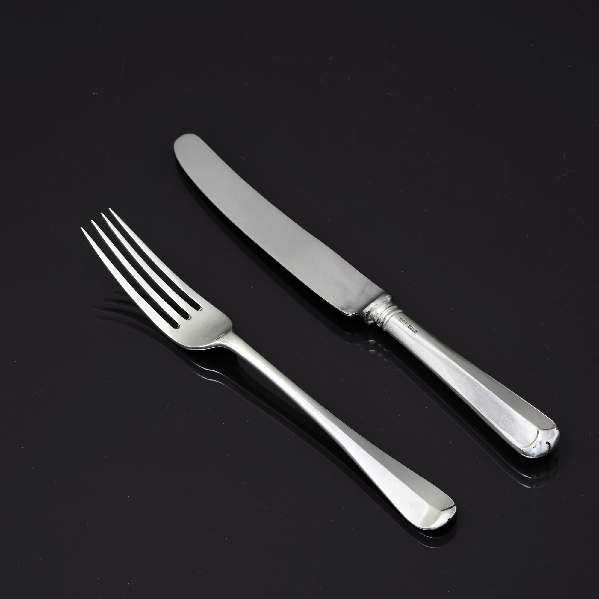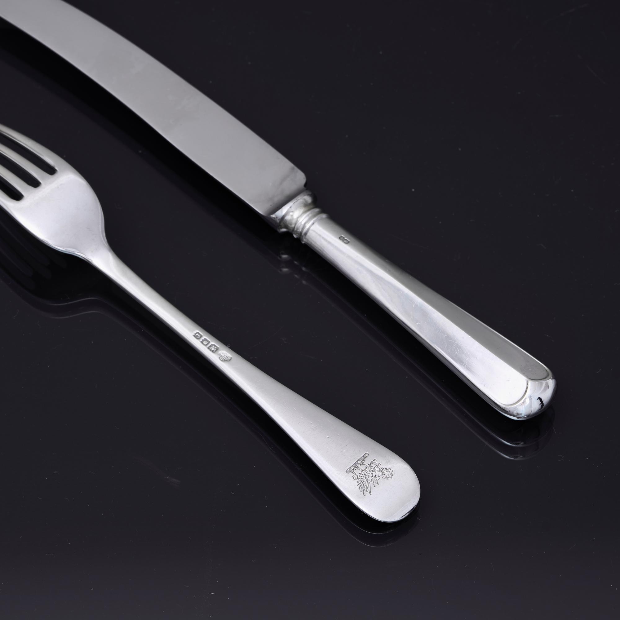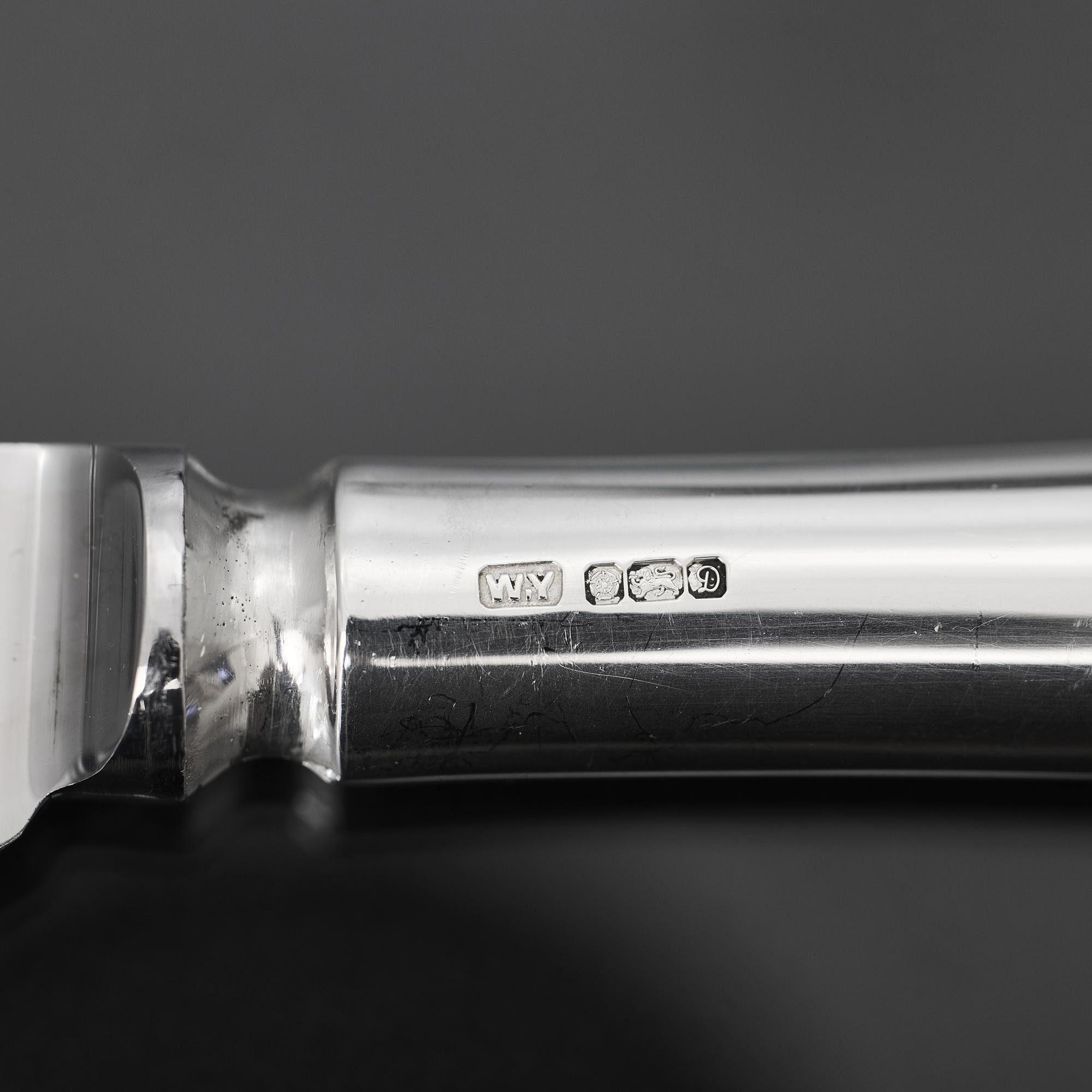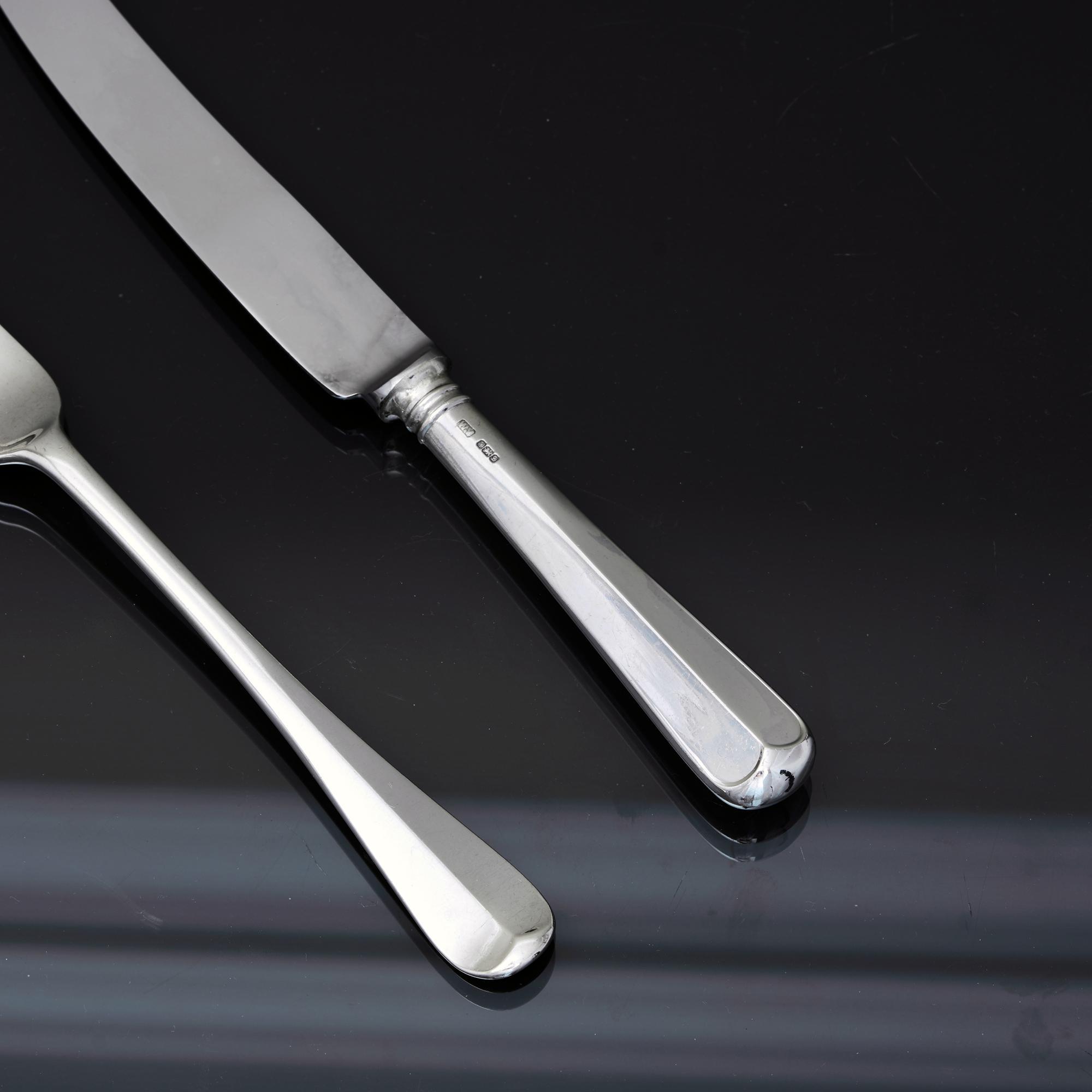 Also included are 12 pairs of modern silver table and dessert knives made by William Yates, Sheffield 1978. Fitted with stainless steel blades they are suitable for putting in the dishwasher.