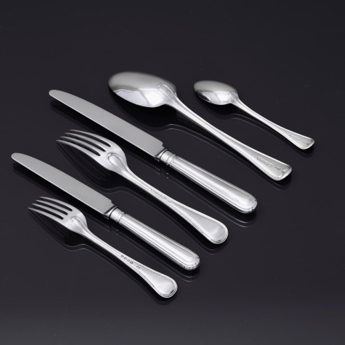 Originating in the 1750s, Old English pattern with its simple clean lines, showing a single thumbnail to the reverse of the bowl and the pip on the front of the forks and the back of the spoons, is the definitive British flatware pattern and remains the most popular pattern through to the present day.