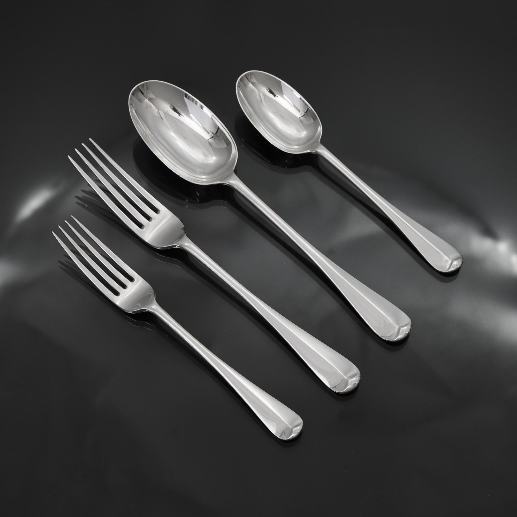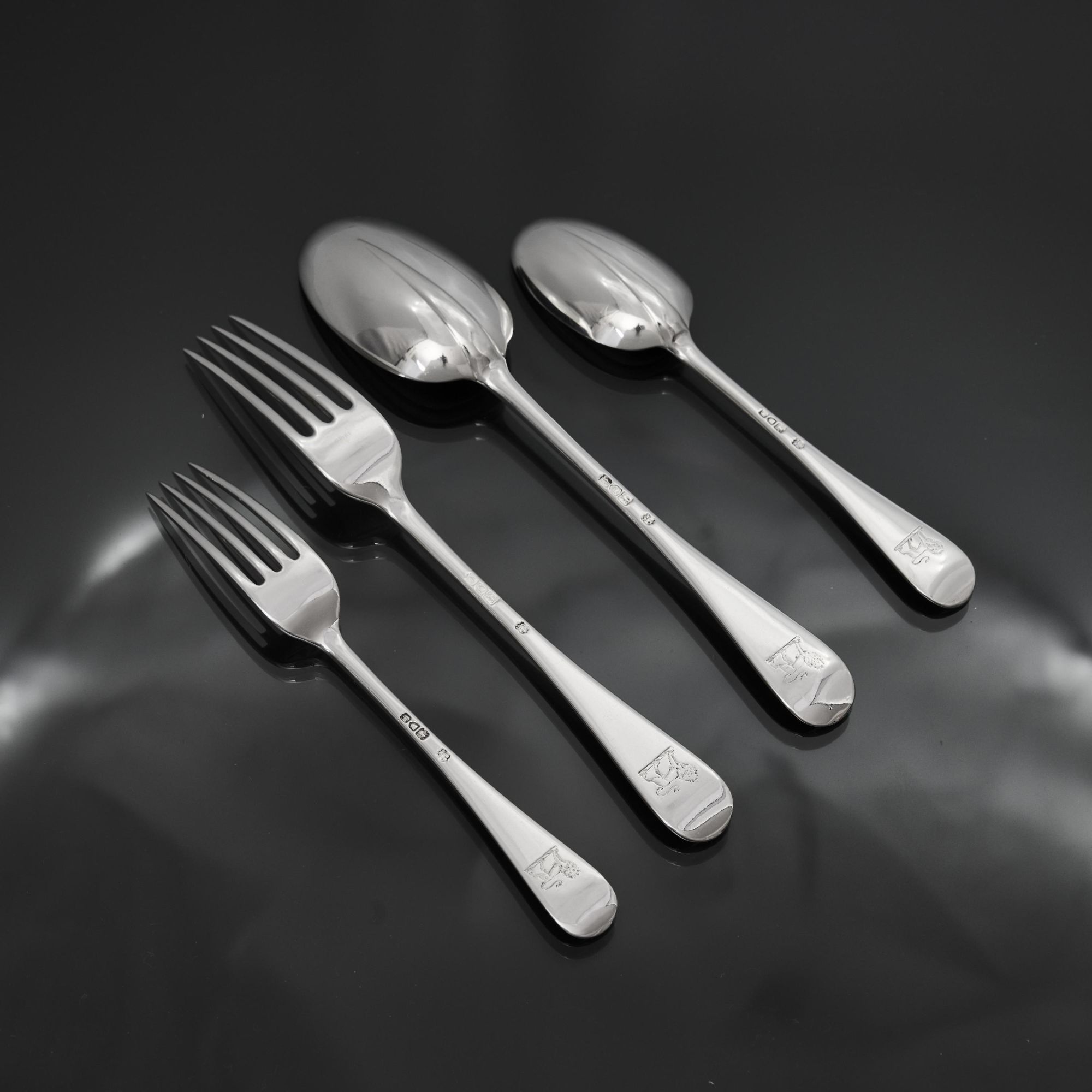 Set of hand-forged Victorian Rattail pattern sterling silver cutlery for 12