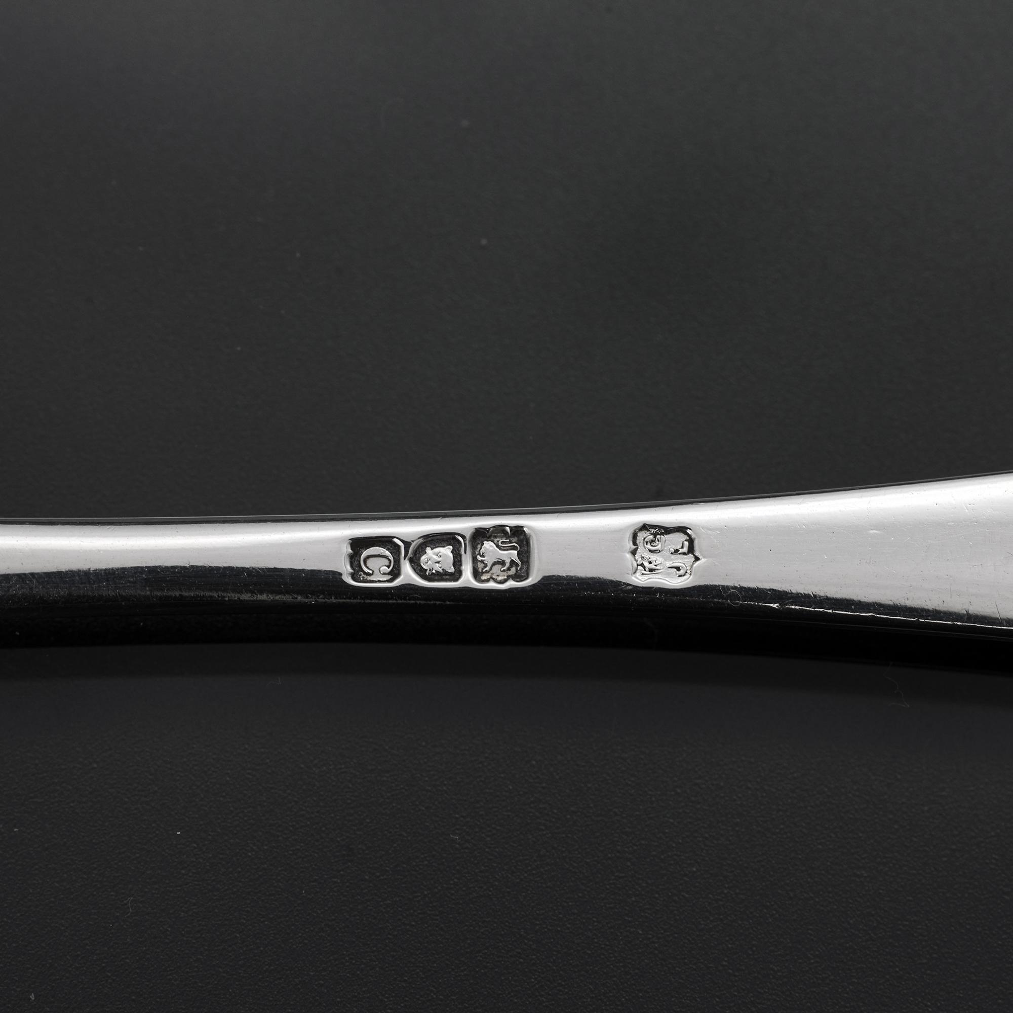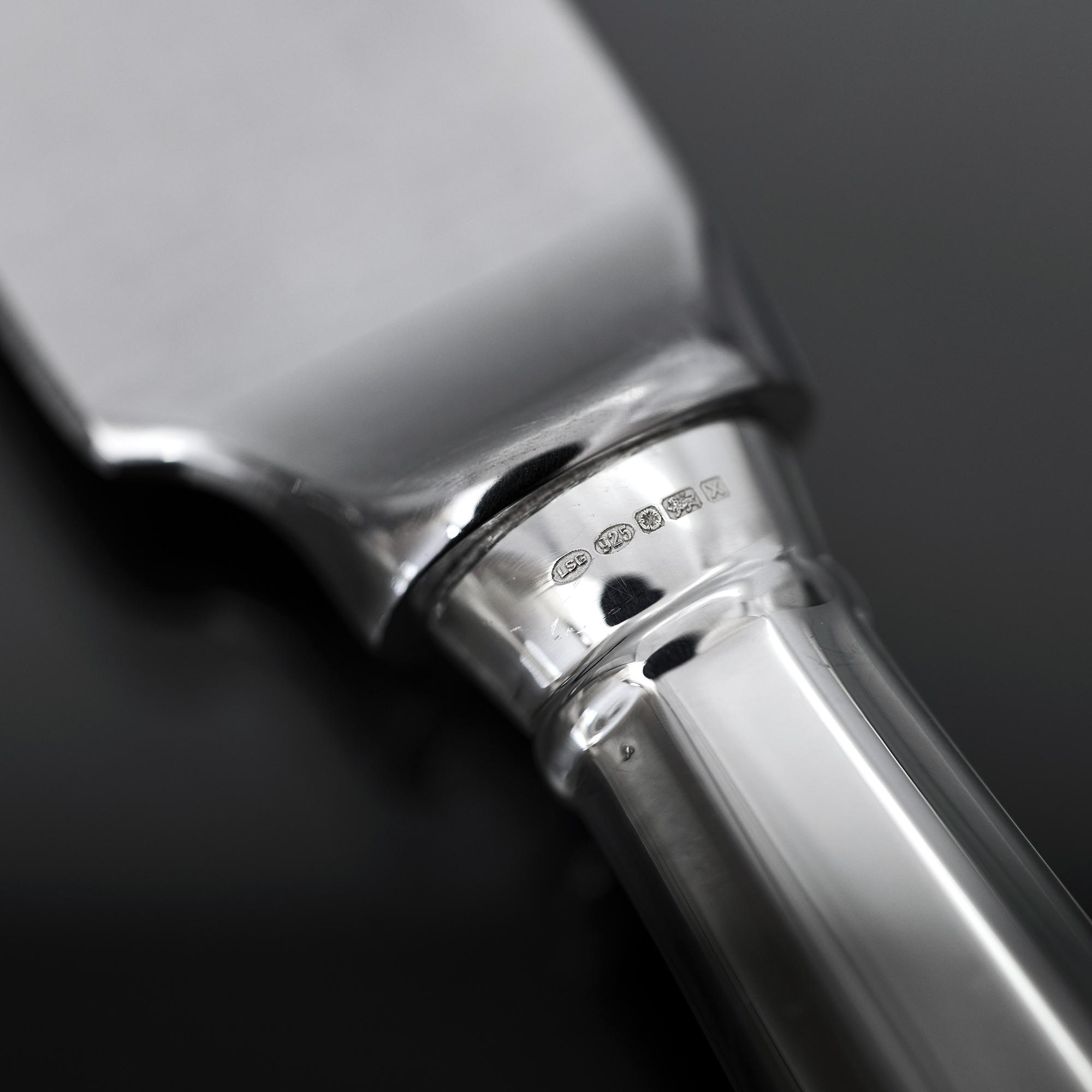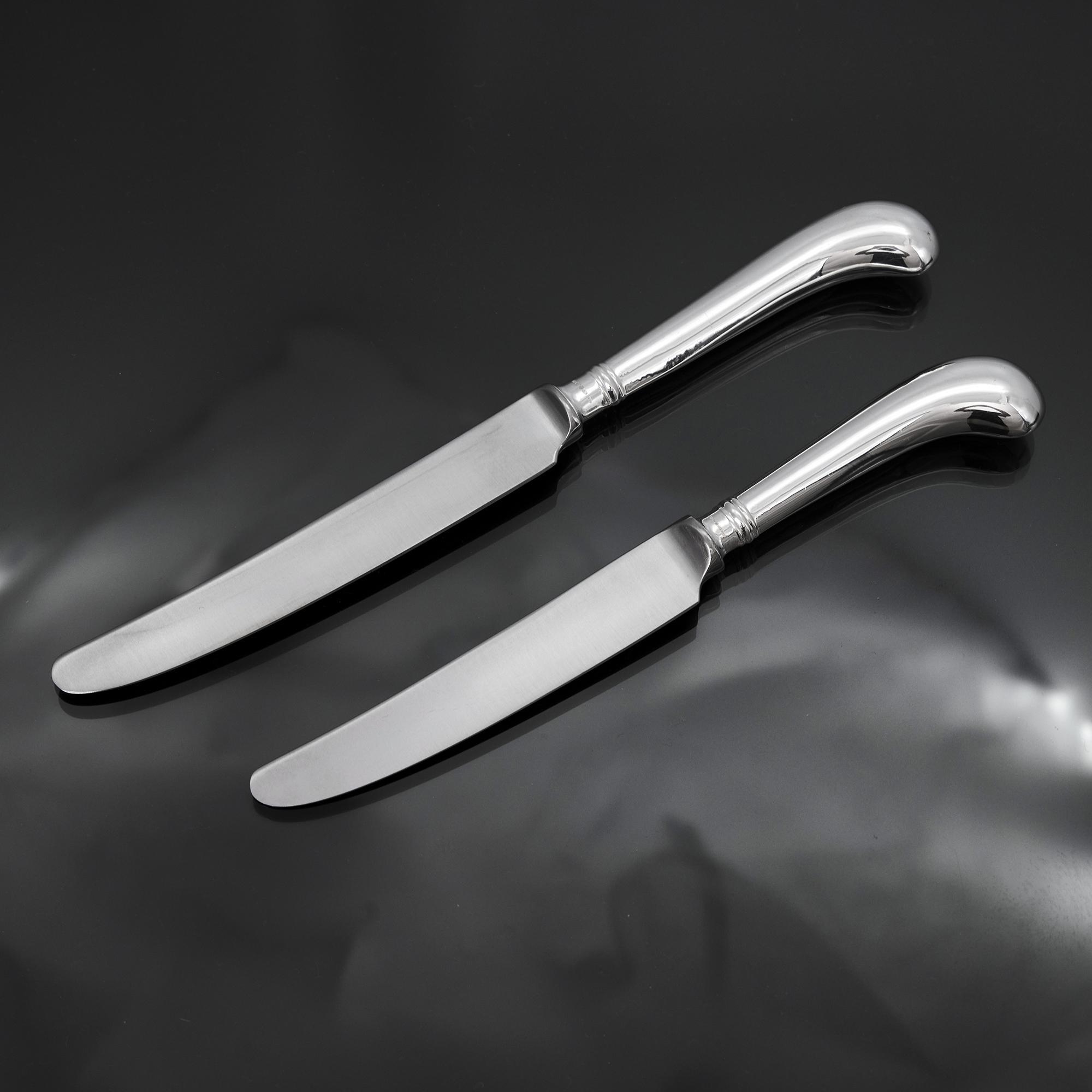 Antique silver knives rarely survive so this set is accompanied by 12 pairs of heavy-gauge hard-soldered Plain Pistol pattern silver table knives and dessert knives made by C J Vander, London 1984. C J Vander was known for producing high-quality flatware, making many of the traditional patterns by hand and some completely modern designs.