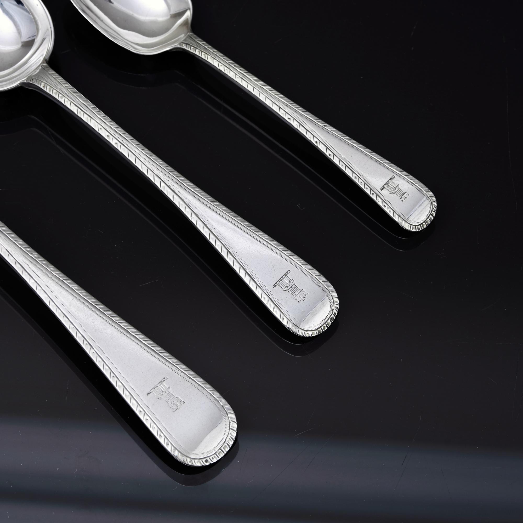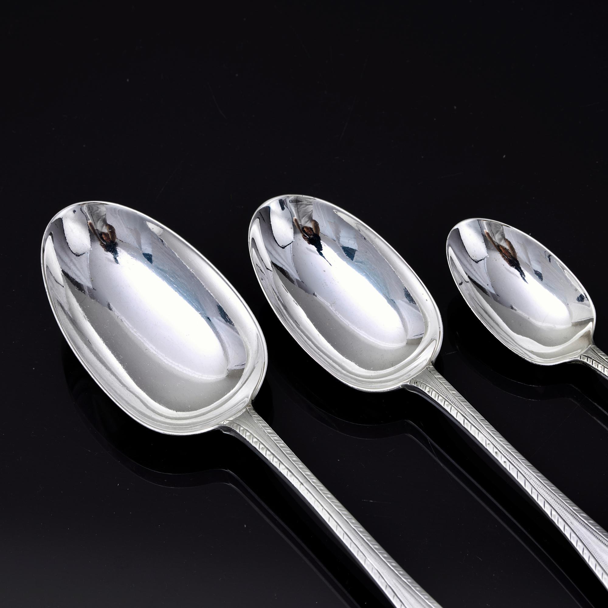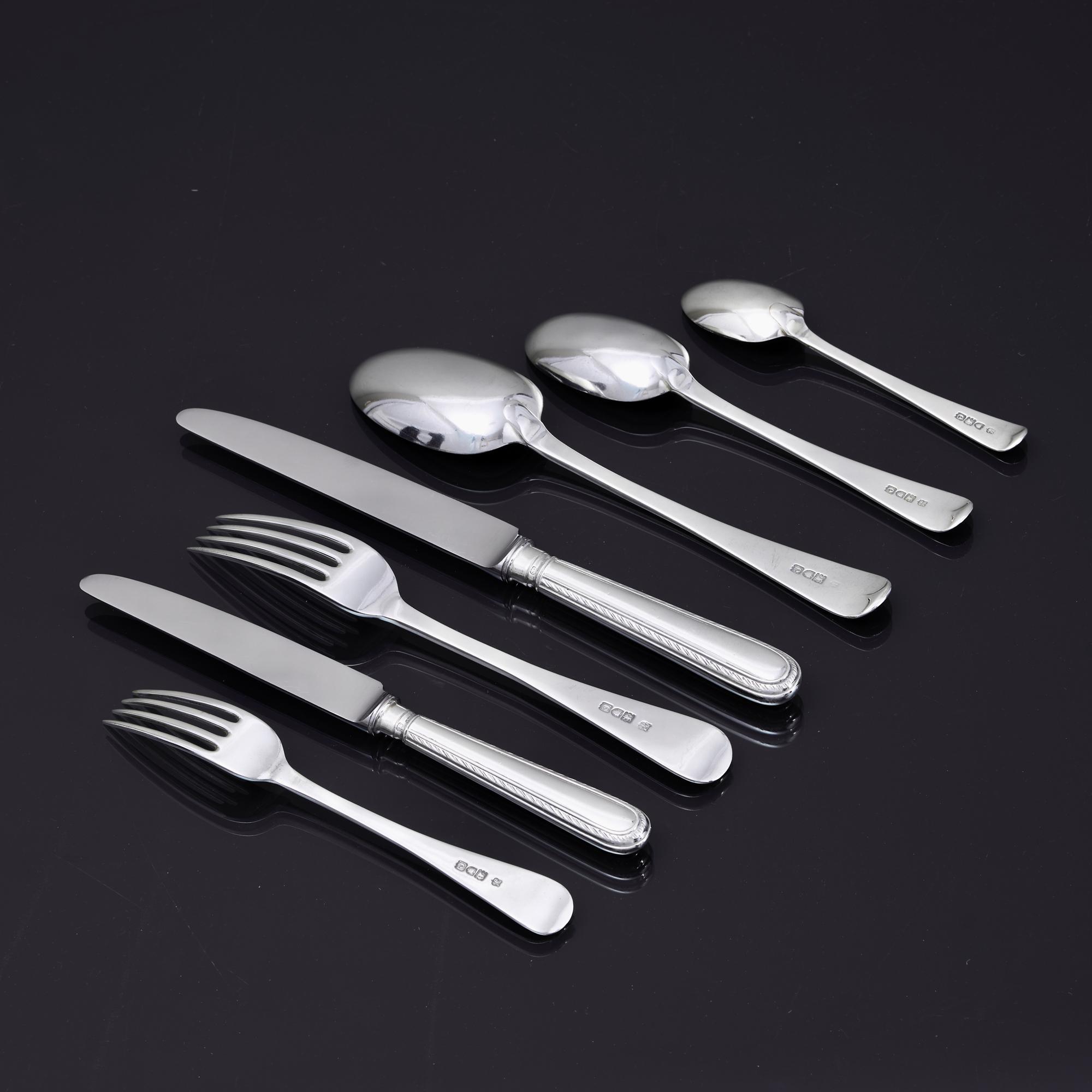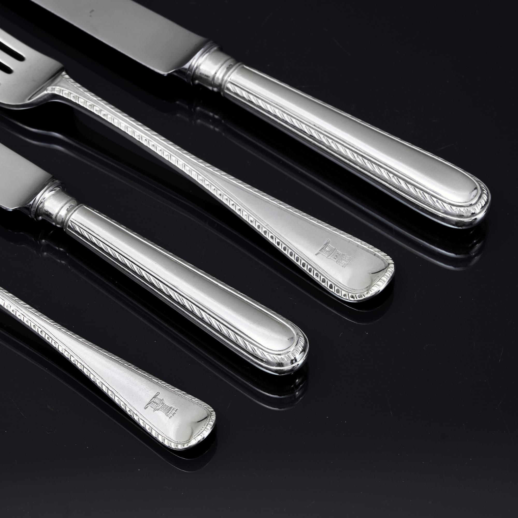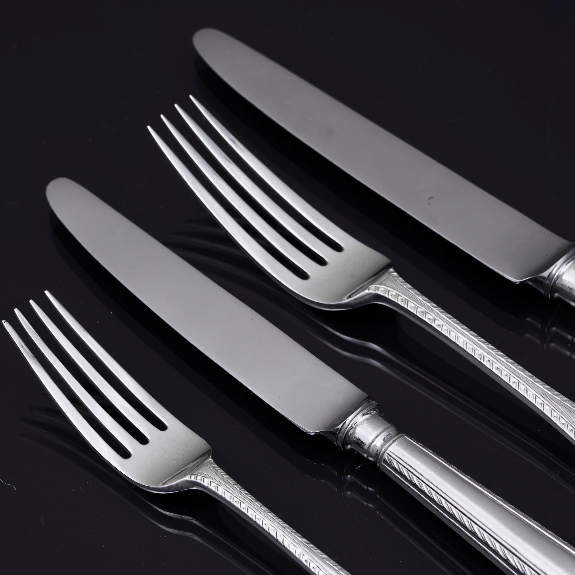 Since antique knives rarely survive, this cutlery service is accompanied by 12 pairs of modern, heavy-gauge hard-soldered silver table and dessert knives, fitted with stainless steel blades making them dishwasher safe.