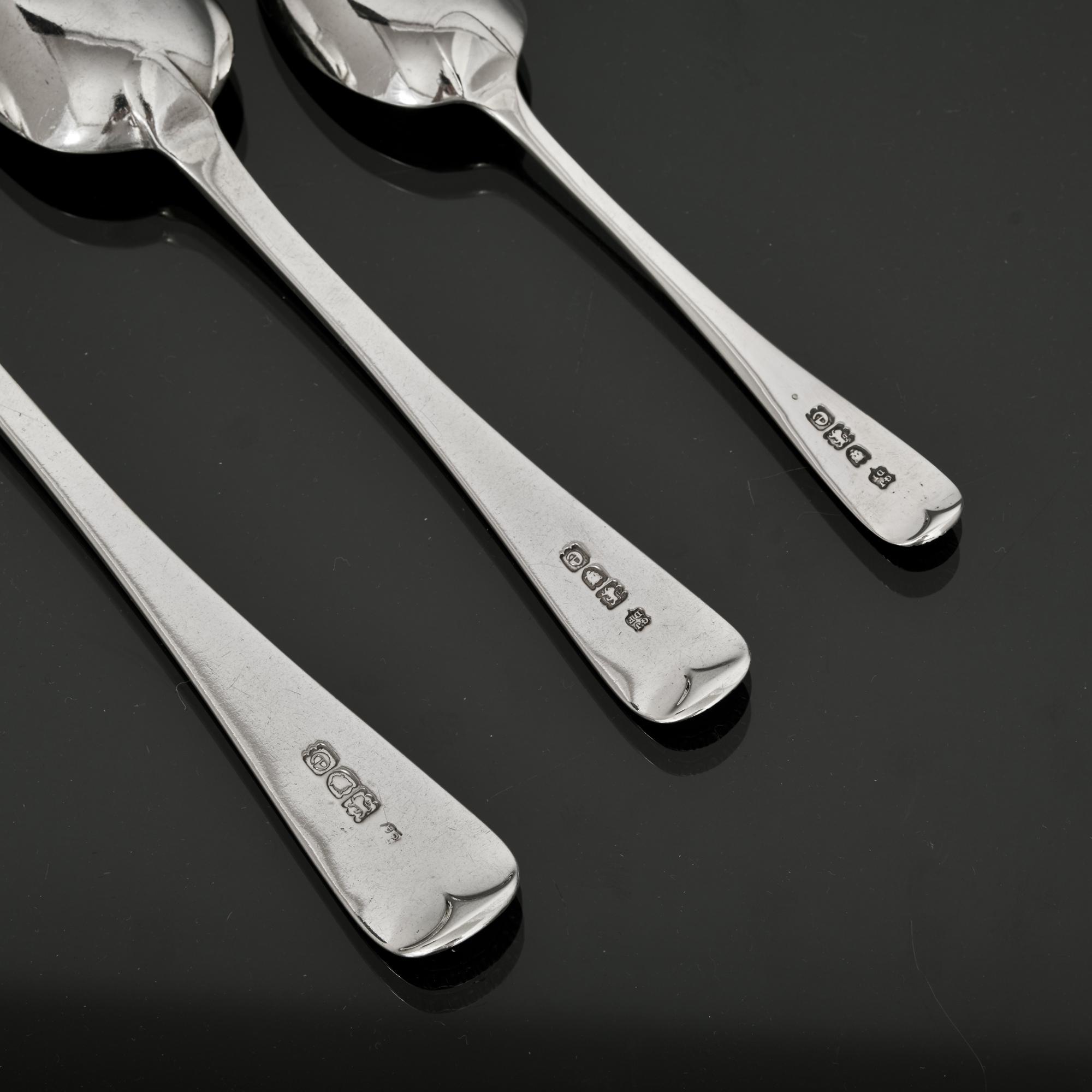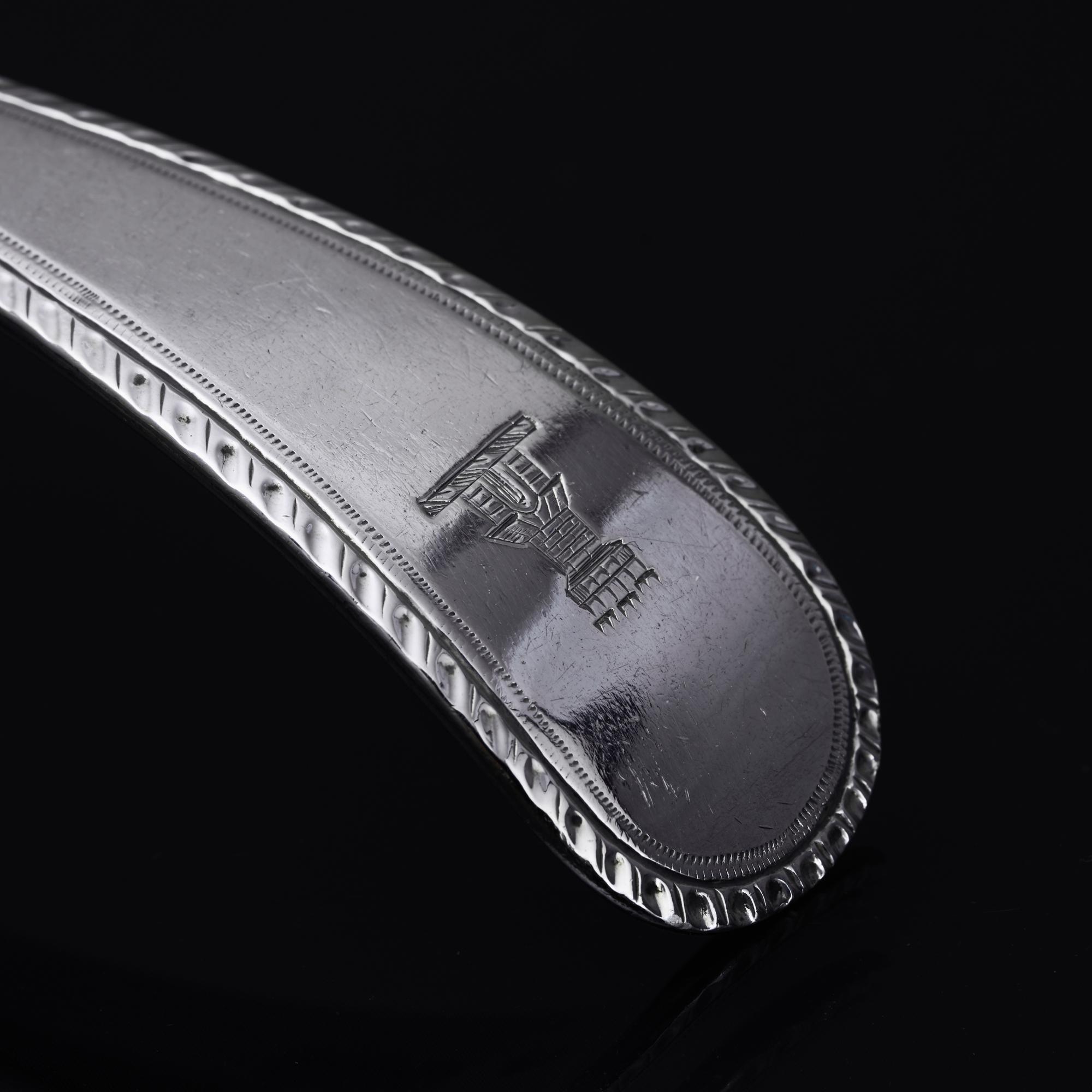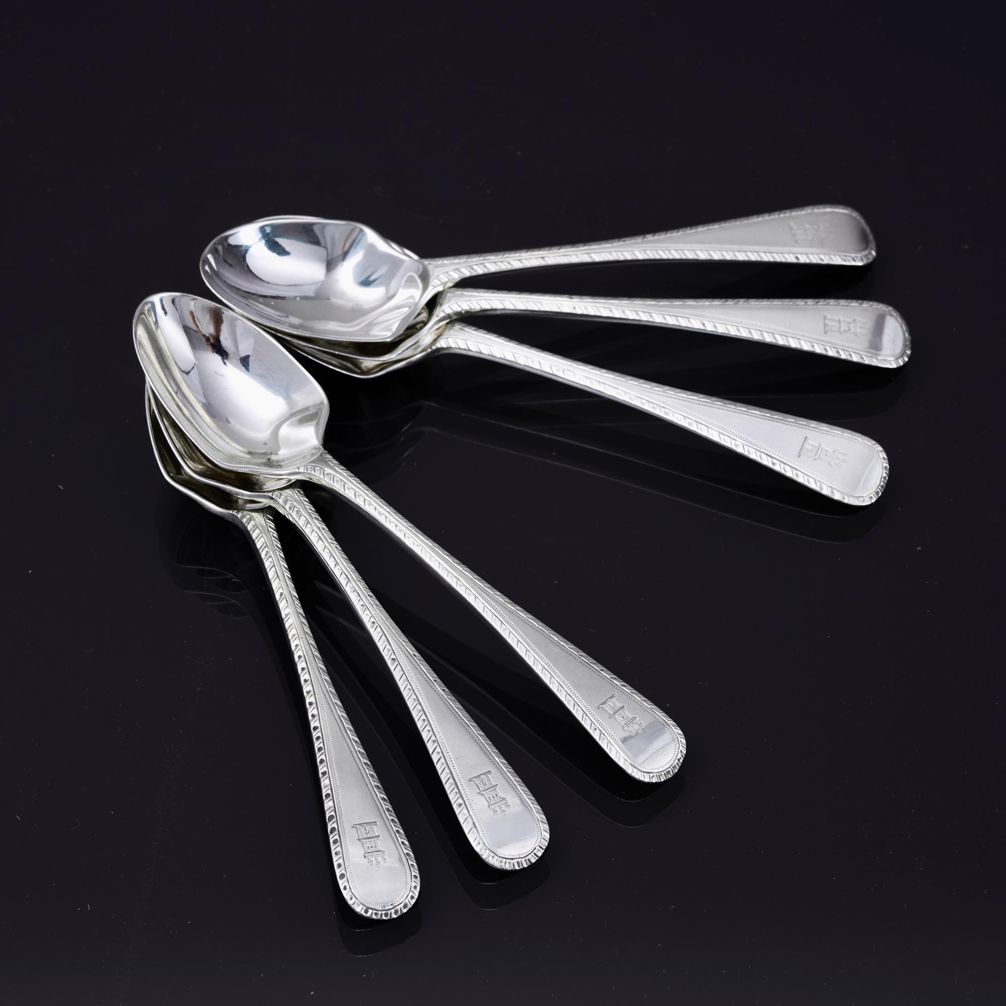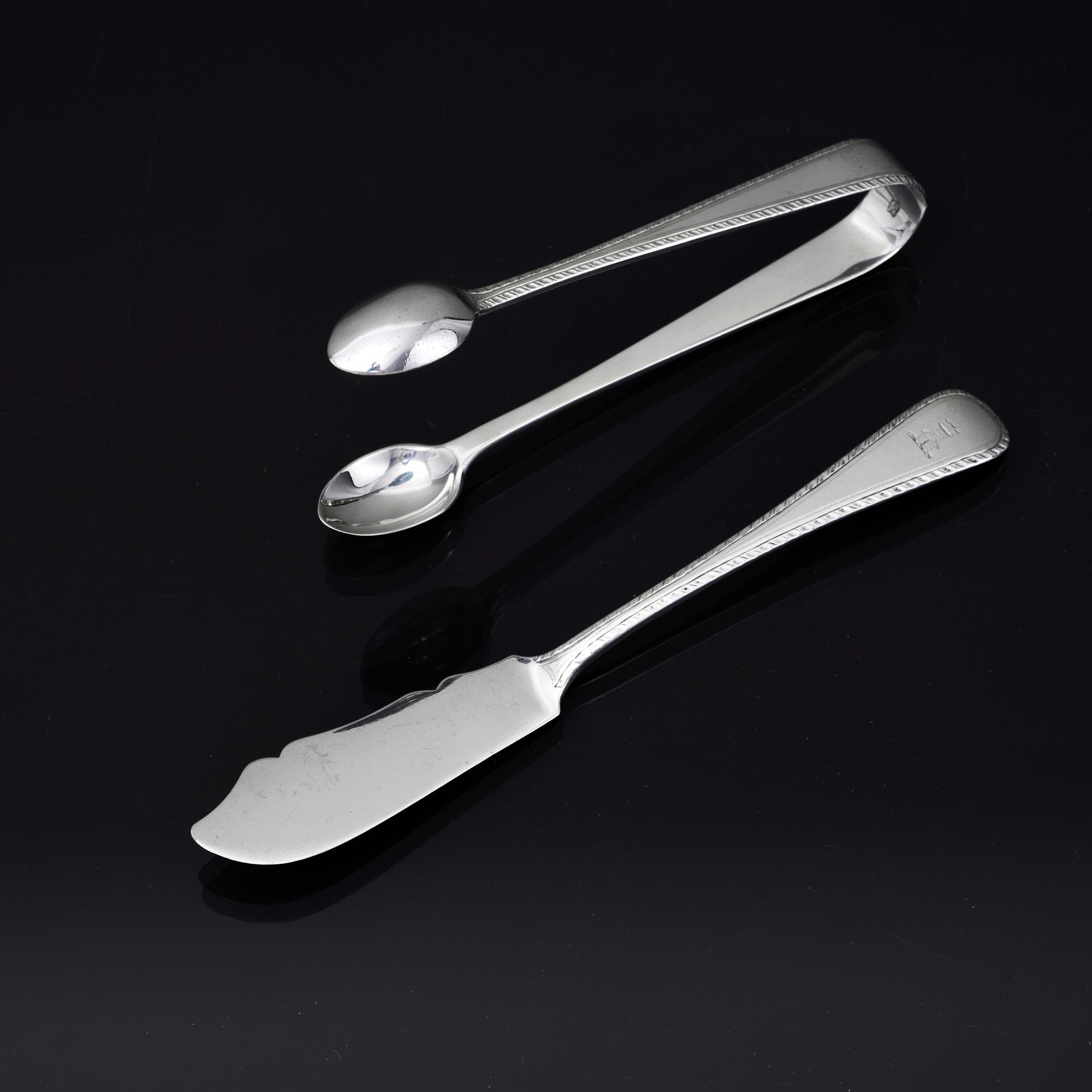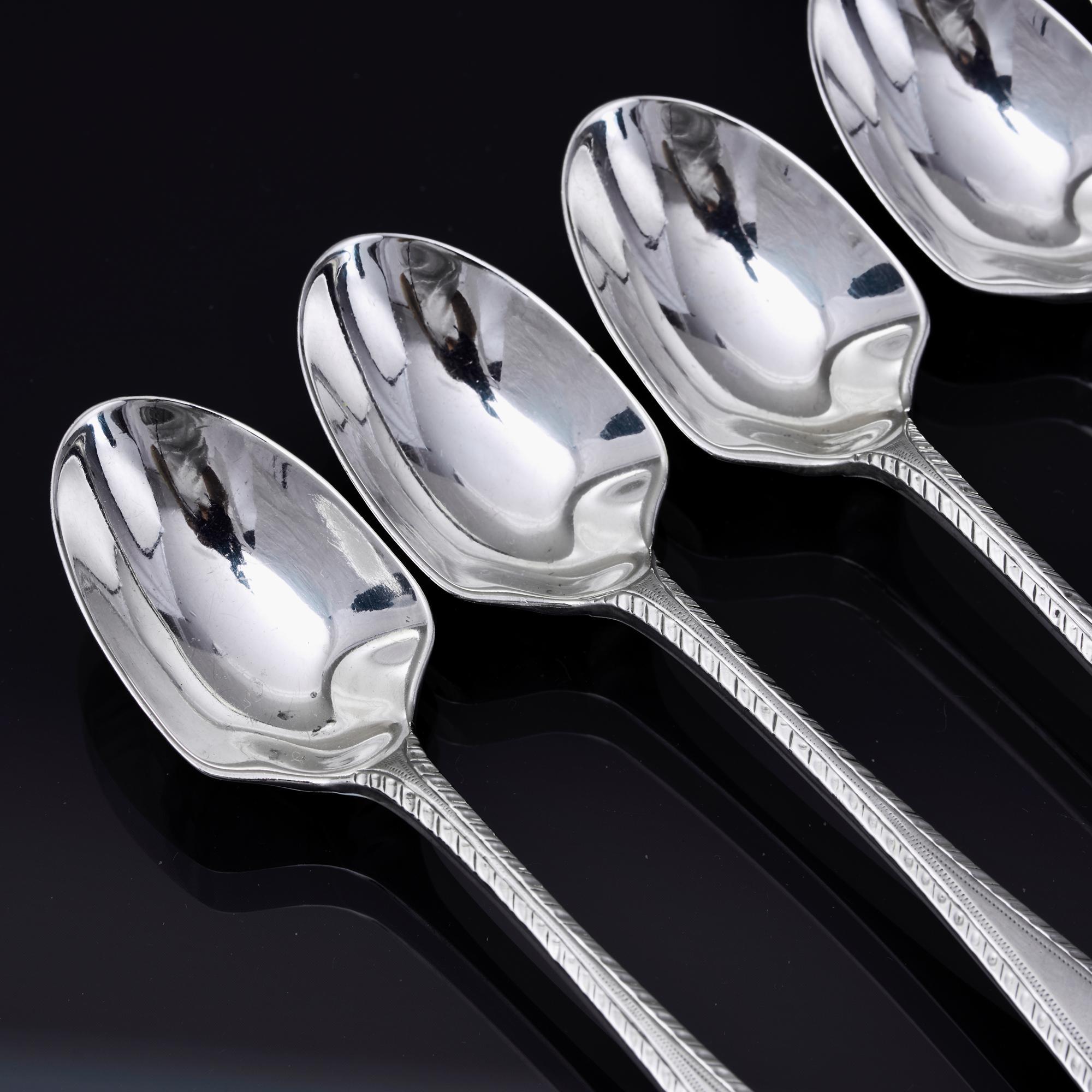 Since antique knives rarely survive, this cutlery service is accompanied by 12 pairs of modern, heavy-gauge hard-soldered silver table and dessert knives, fitted with stainless steel blades making them dishwasher safe.