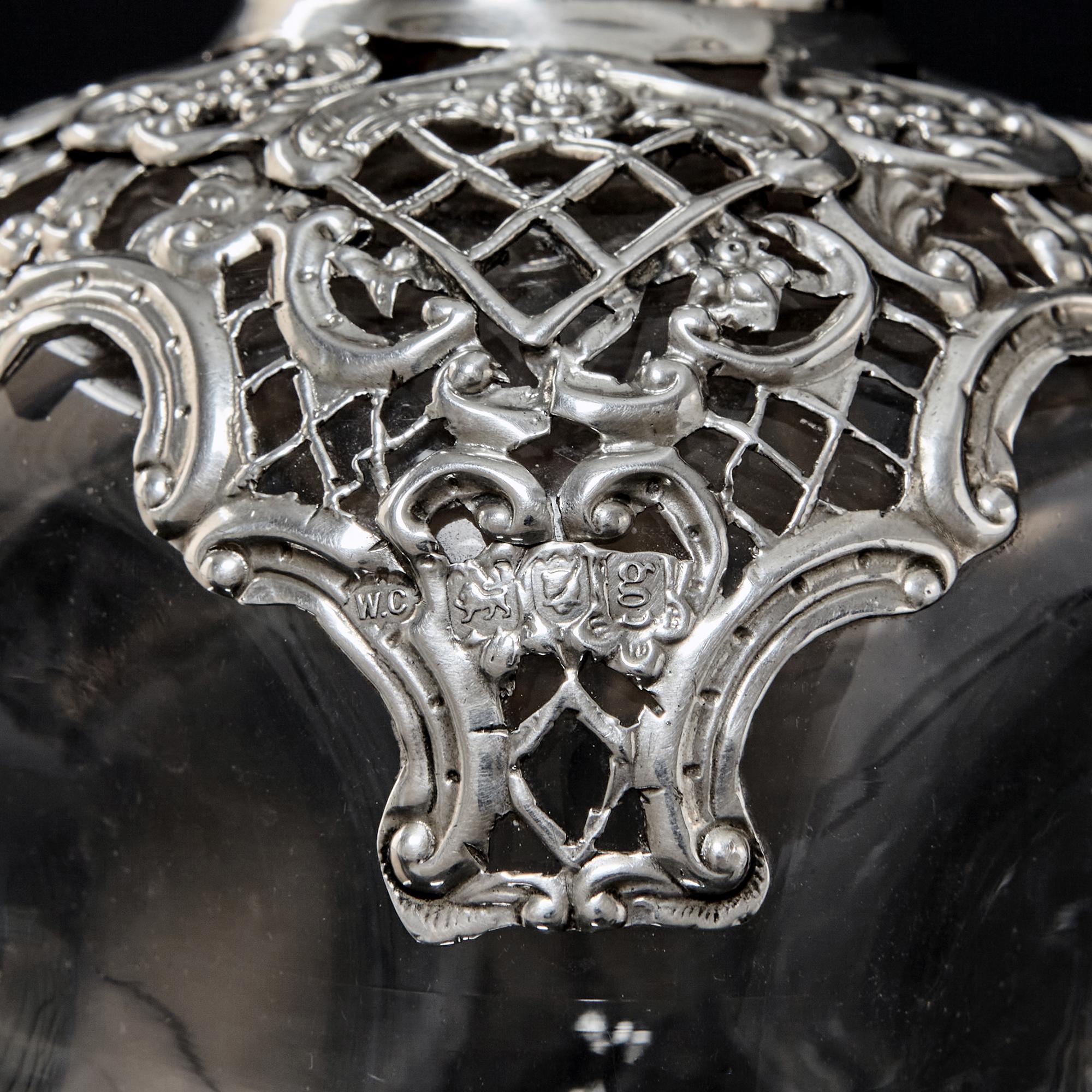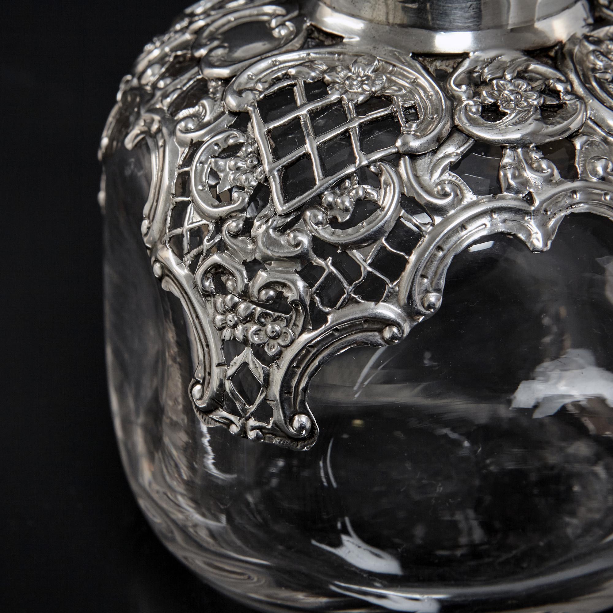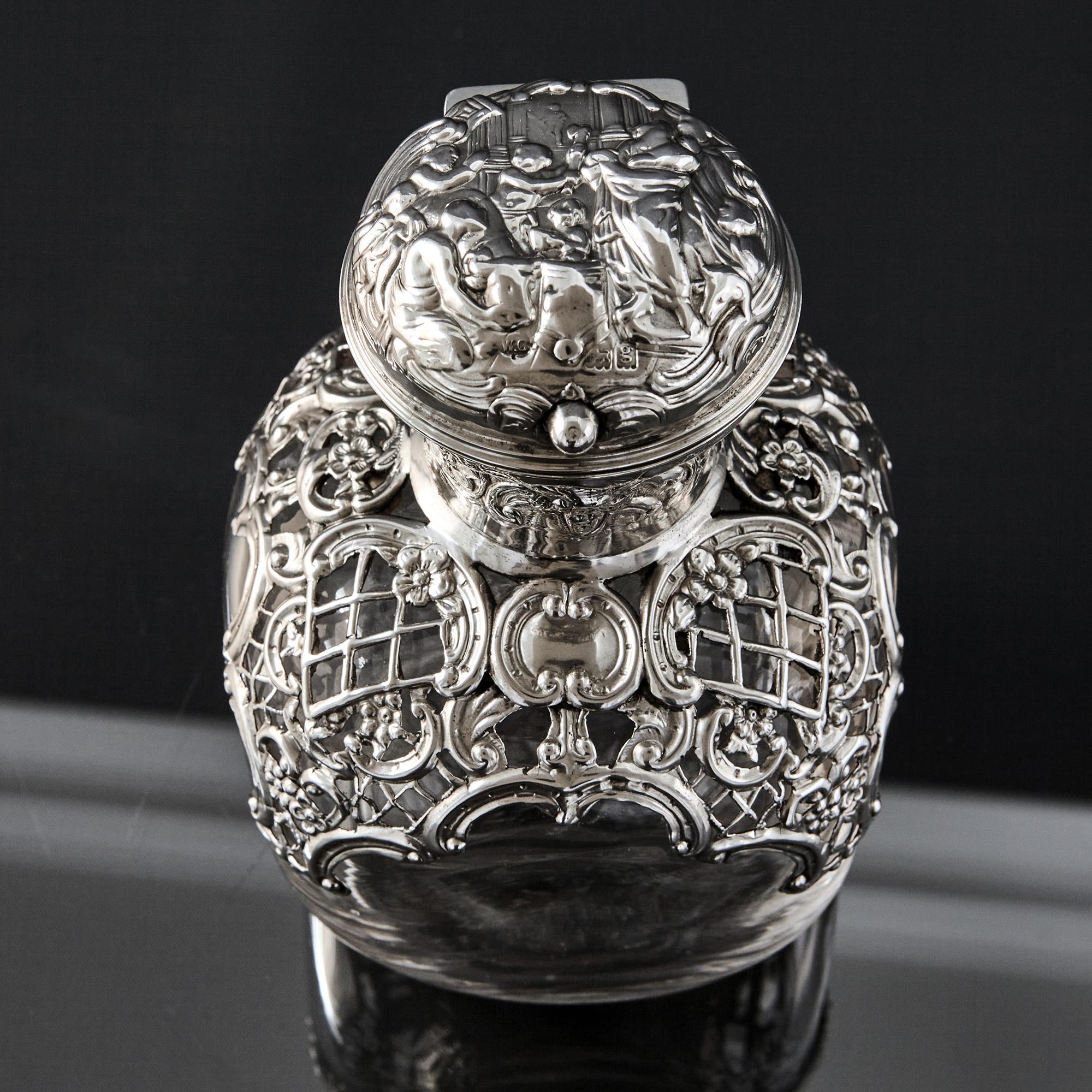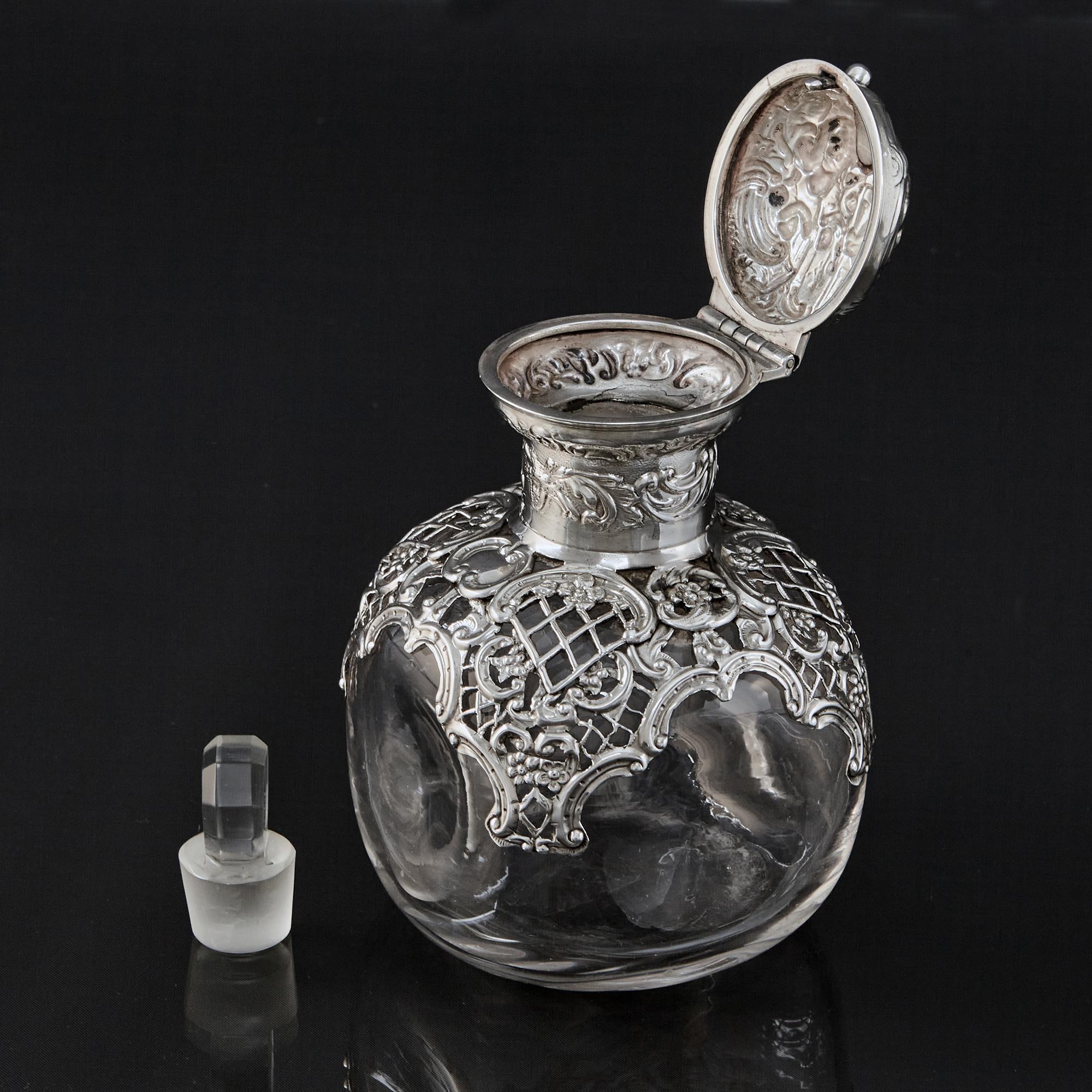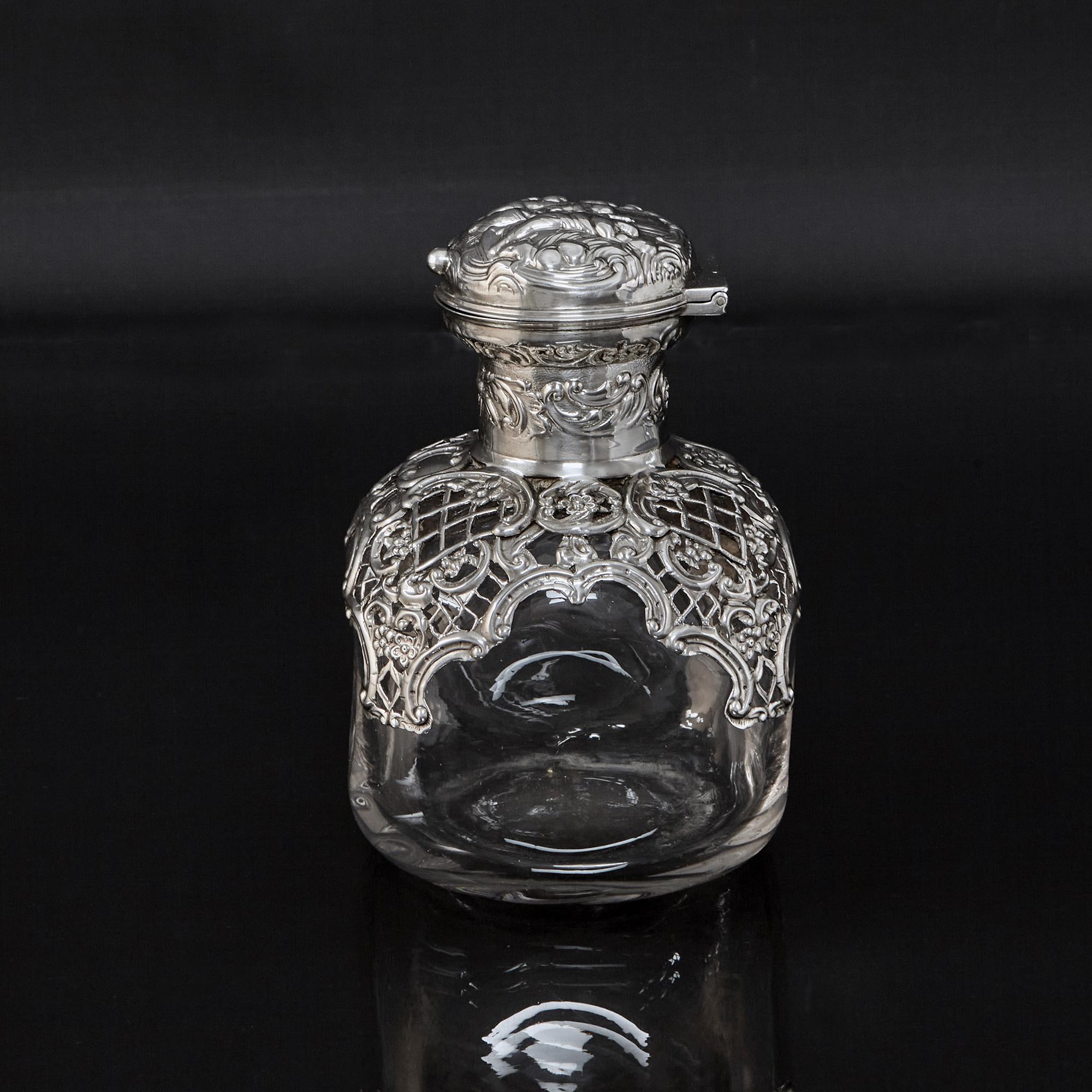Handblown antique glass perfume bottle and stopper with pinched sides and covered with a highly decorative openwork silver apron of hand-pierced silver lattice and scrolls. The embossed collar features masks, scrolls and foliage, while the hinged silver cover, with its push button opening mechanism, depicts a scene of ancient classical figures.