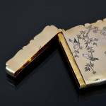 Large, traditional antique silver-gilt card case, engraved through the gilding with finely detailed oak leaves, acorns and branches, with a bird chasing an insect on one side, birds on branches of buds, blossoms, cherry blossoms and catkins in the Aesthetic style. The gilding is original.