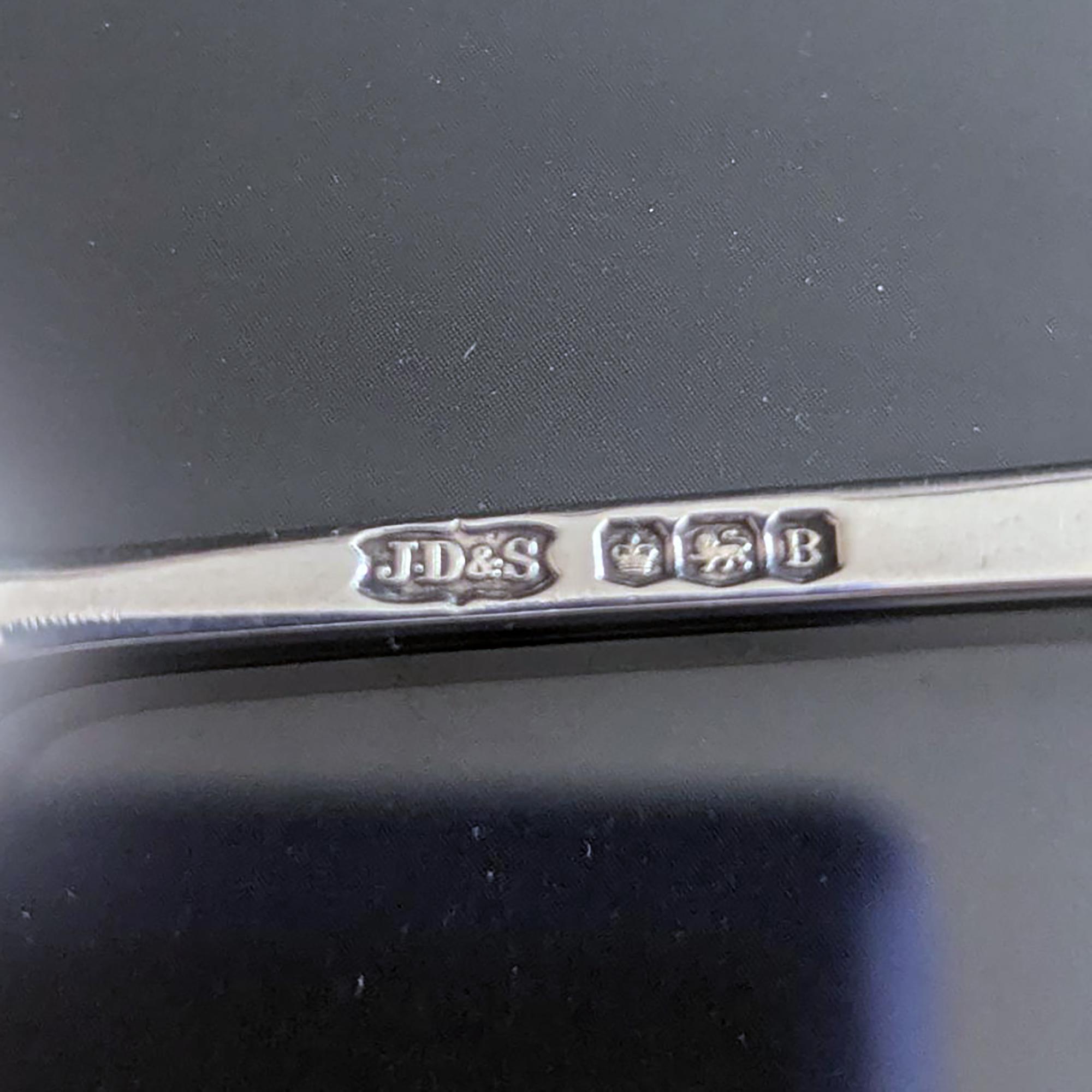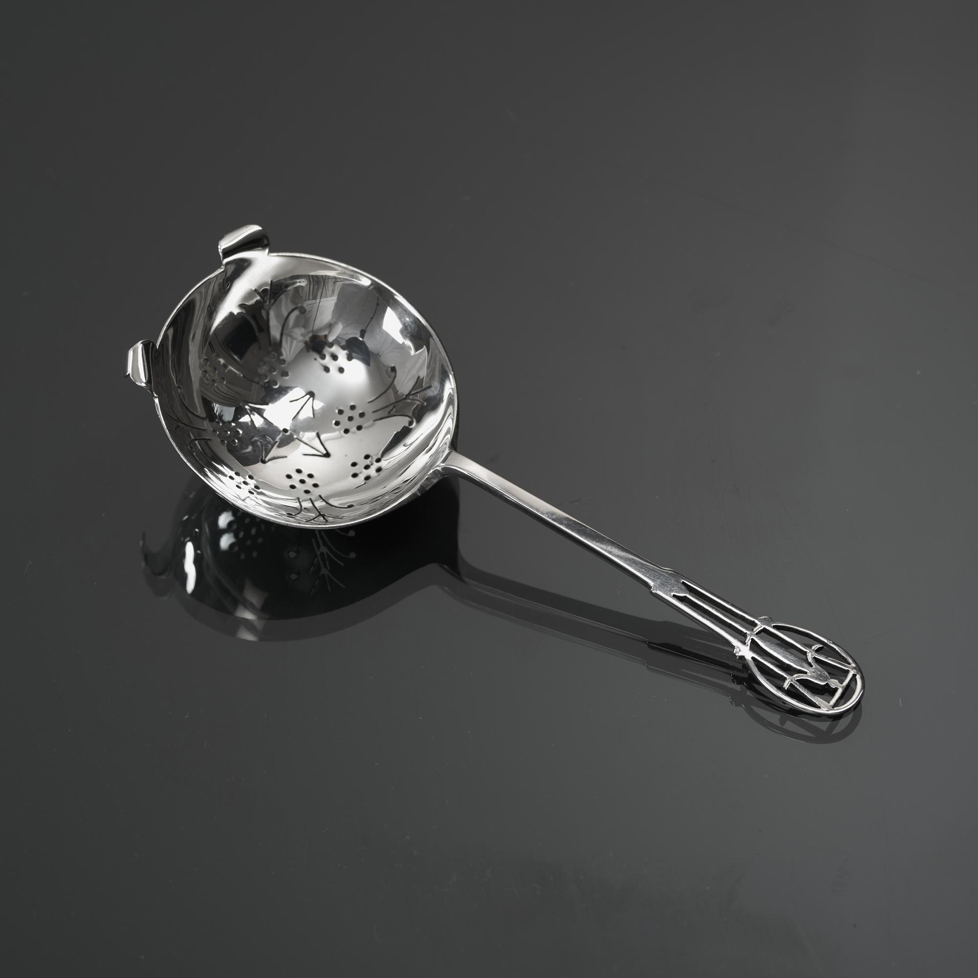 Art Deco style silver tea strainer with hand-pierced bowl that features clip-over mounts to rest on the edge of the tea cup, and a hand-pierced handle finial decorated with an elongated bellflower. The bowl is hand-pierced with geometric patterns.