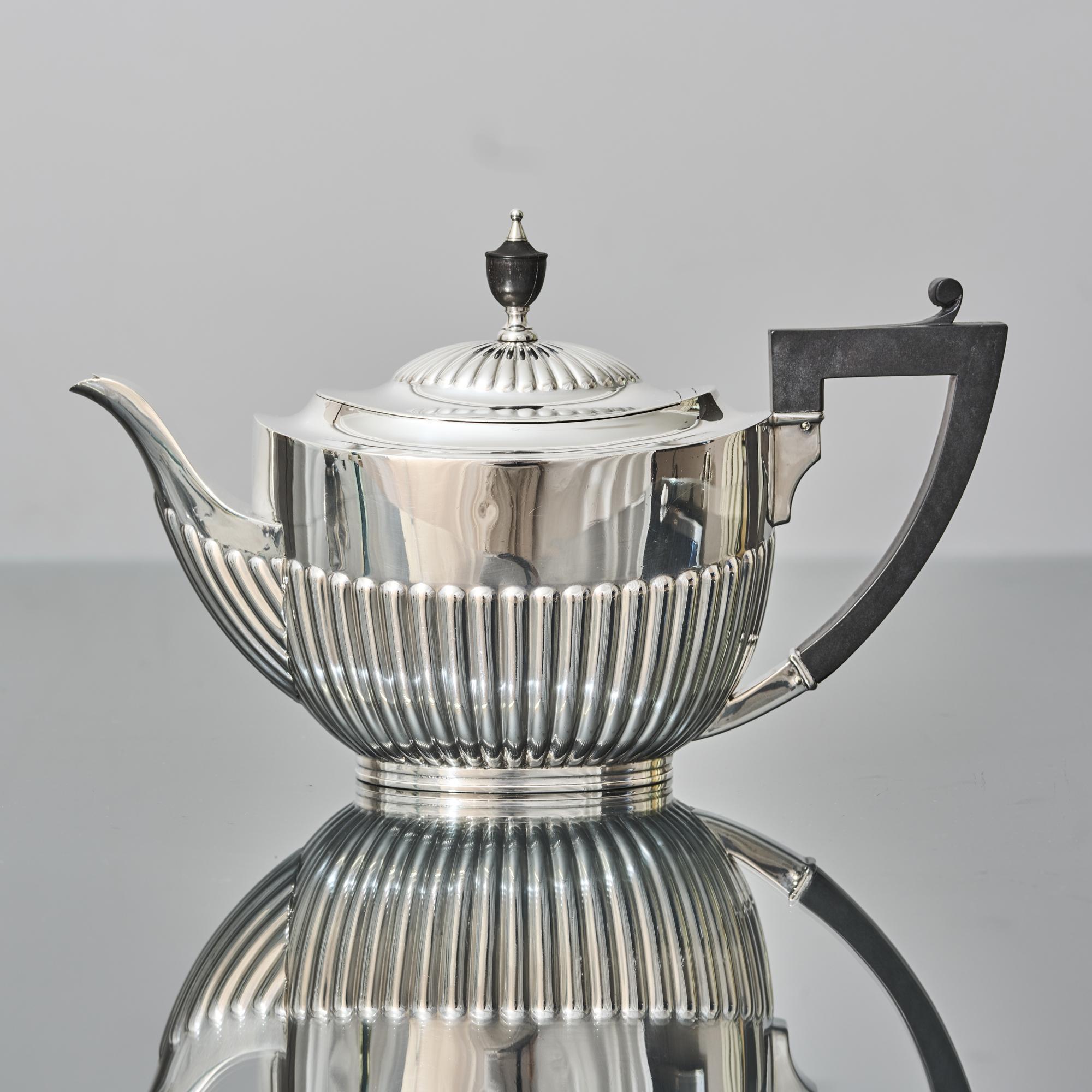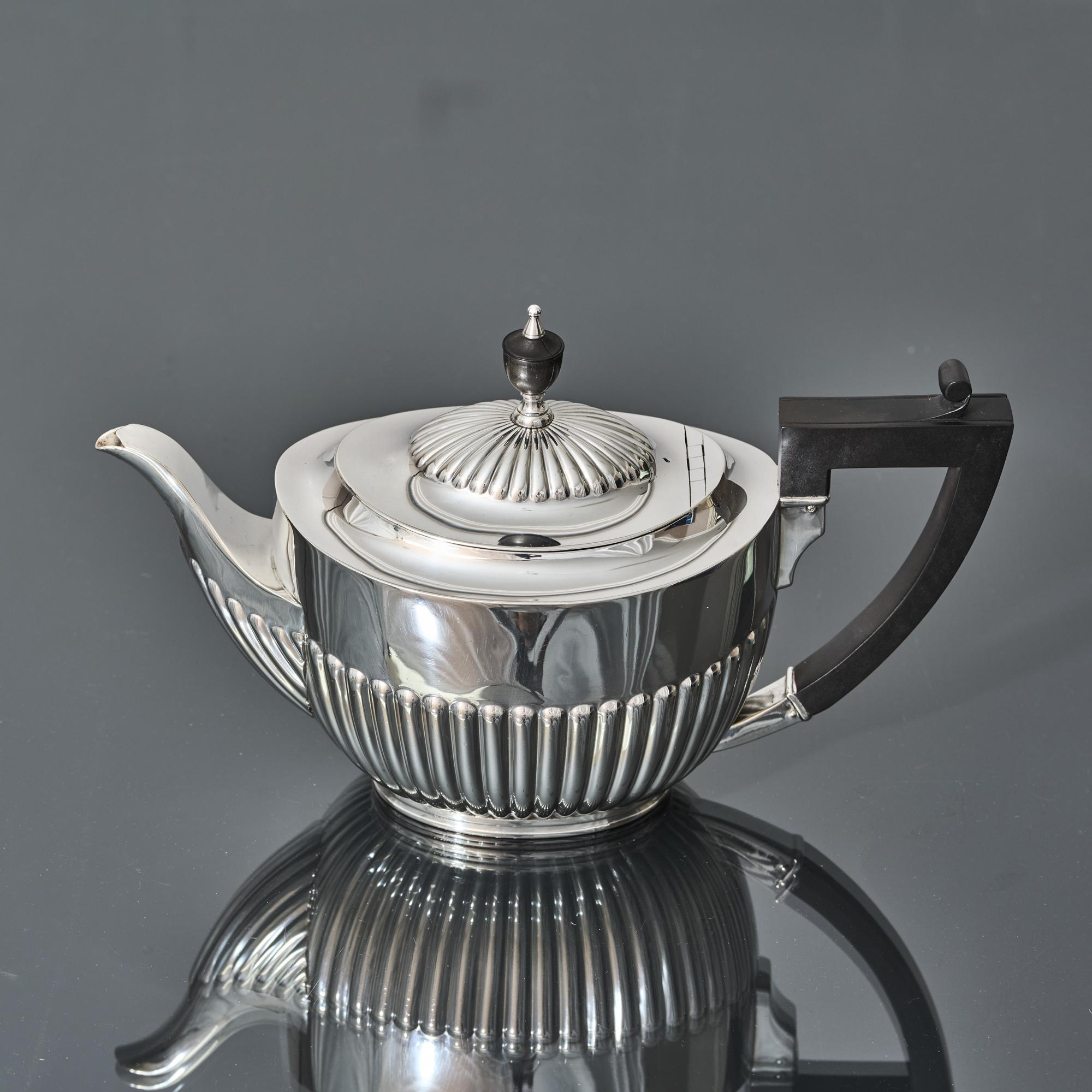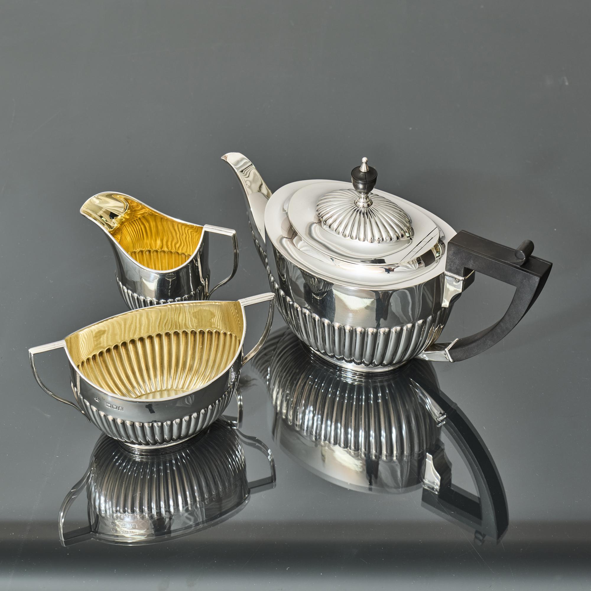 Classic, Victorian Queen-Anne-style three-piece silver tea set with all pieces featuring the characteristic half-fluted bodies. Although the pattern is referred to as Queen Anne style, it is in fact more reminiscent of the neoclassical revival era of the 1790s.