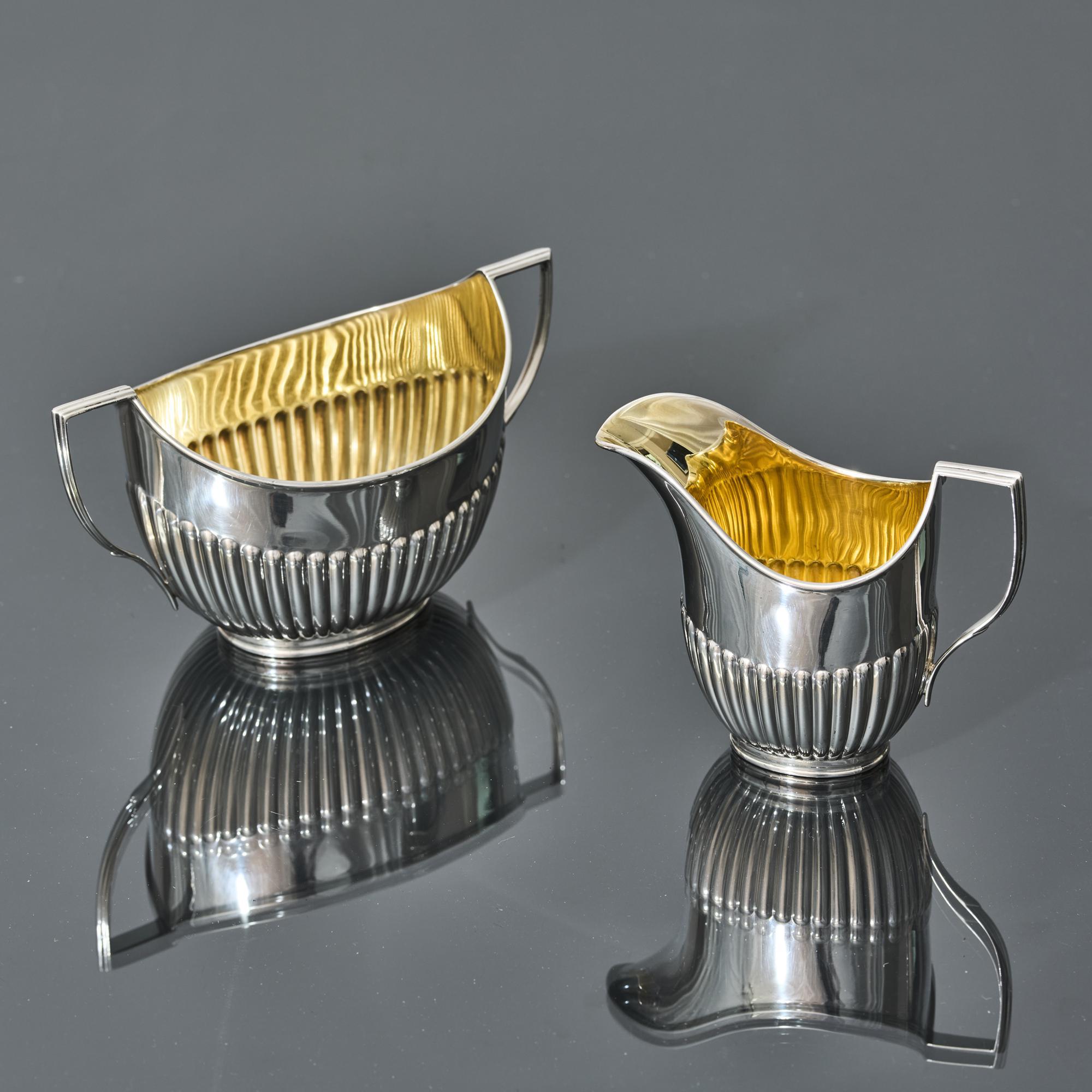 The elegant silver teapot pours perfectly and is fitted with an ebonised fruitwood handle and finial, while the domed cover features a jeweller's flush hinge, a mark of superior quality. The interiors of the sugar bowl and milk jug are gilded.