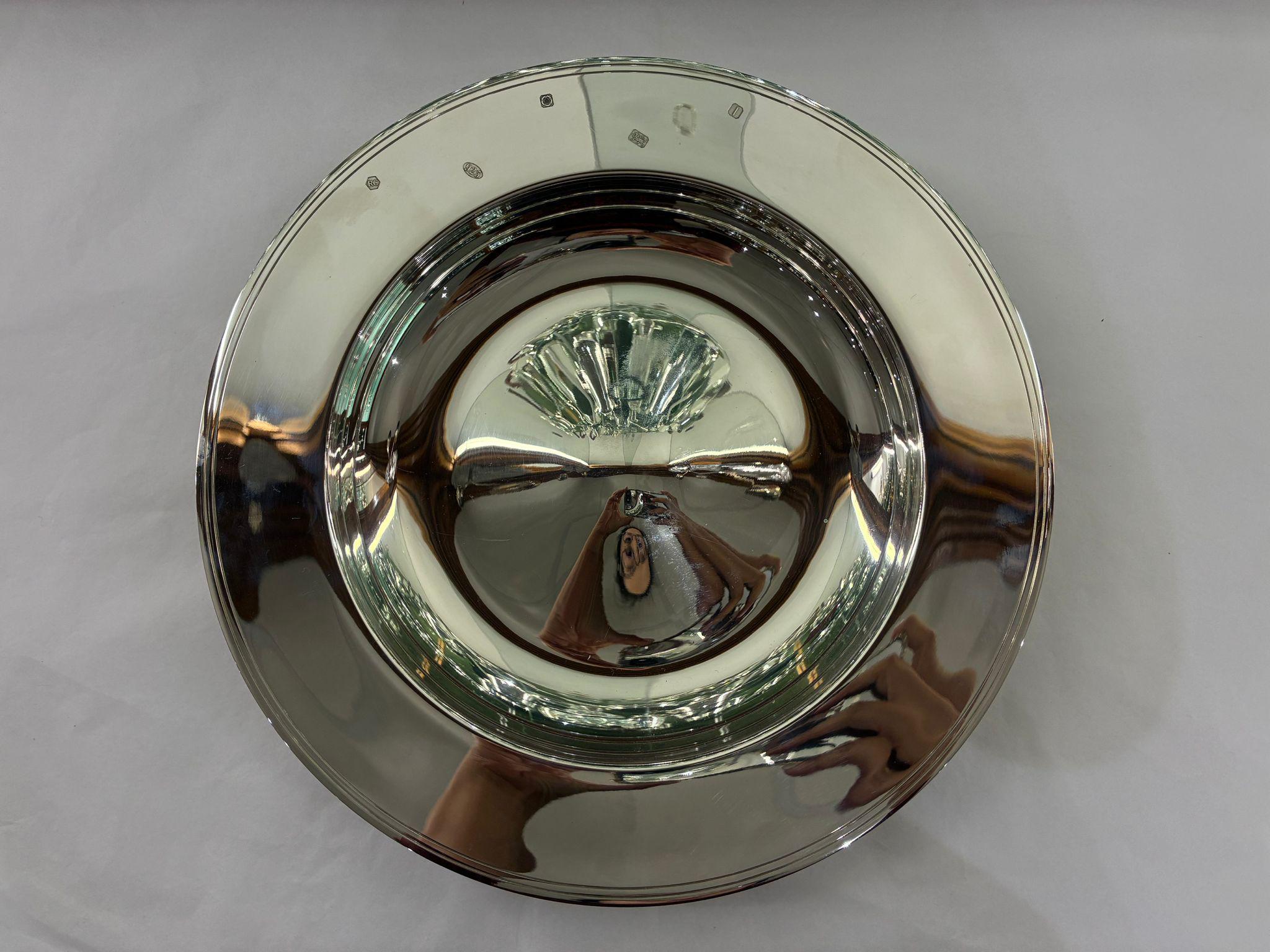 Classic, large silver armada dish - a shallow circular bowl with flared rim and raised centre.