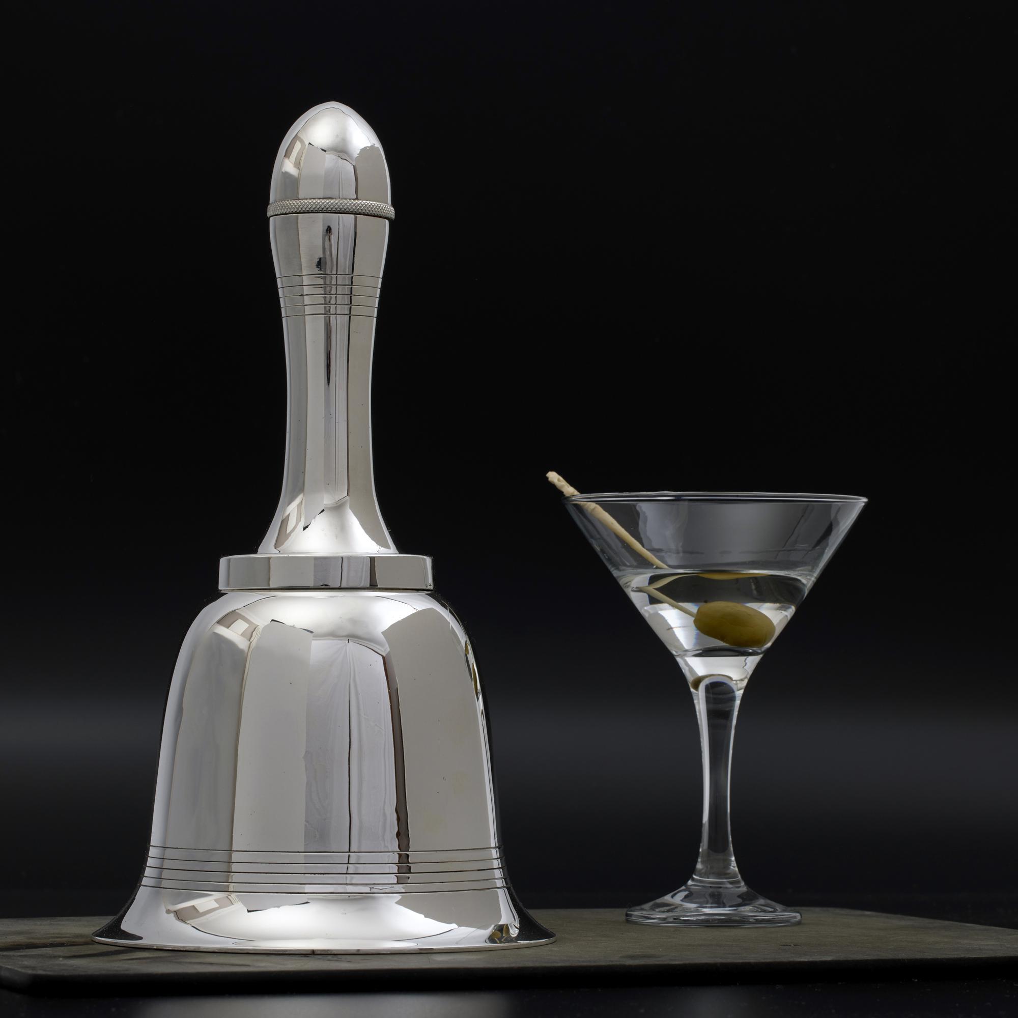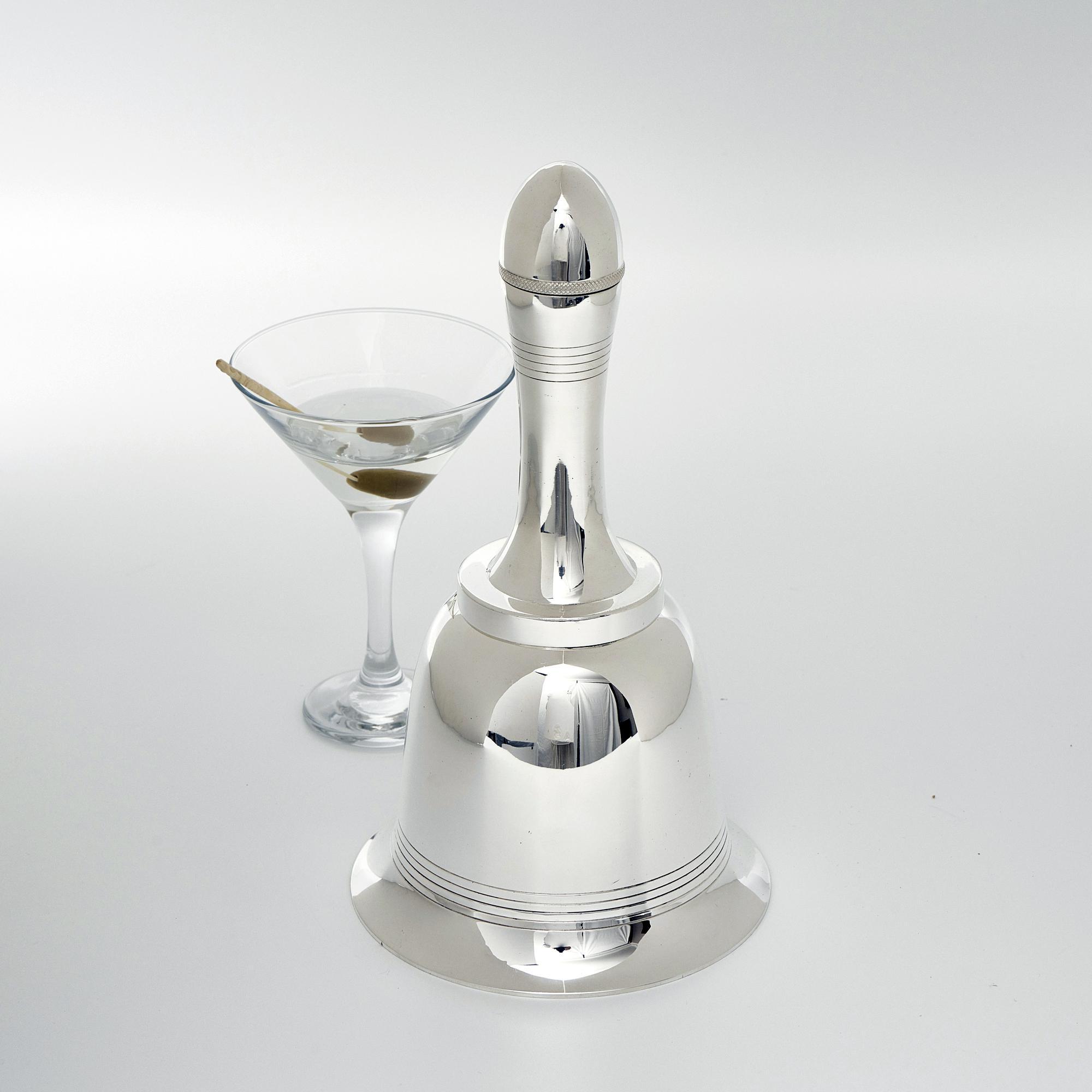 Classic 1930s silver-plated novelty cocktail shaker in the form of a hand bell, made by Asprey & Company. The upper section of the of the handle unscrews to allow pouring while the lower part of the handle unscrews for ingredients to be added. The filter is inside the handle.